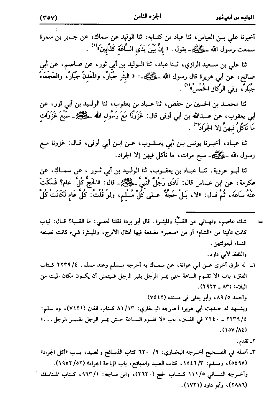 حَدَّثَنَا مُحَمد بْنُ الْحُسَيْنِ بْنِ حَفْصٍ، حَدَّثَنا عَبَّادُ بْنُ يَعْقُوبَ، حَدَّثَنا الْوَلِيدُ بْنُ أَبِي ثَوْرٍ، عَن أَبِي يَعْقُوبَ عَنْ عَبد اللَّهِ بْنِ أَبِي أَوْفَى قَالَ غَزَوْنَا مَعَ رَسُولِ اللَّهِ صَلَّى اللَّهُ عَلَيْهِ وَسَلَّمَ سَبْعَ غَزَوَاتٍ مَا نأكل فيهن إلاَّ الجراد.