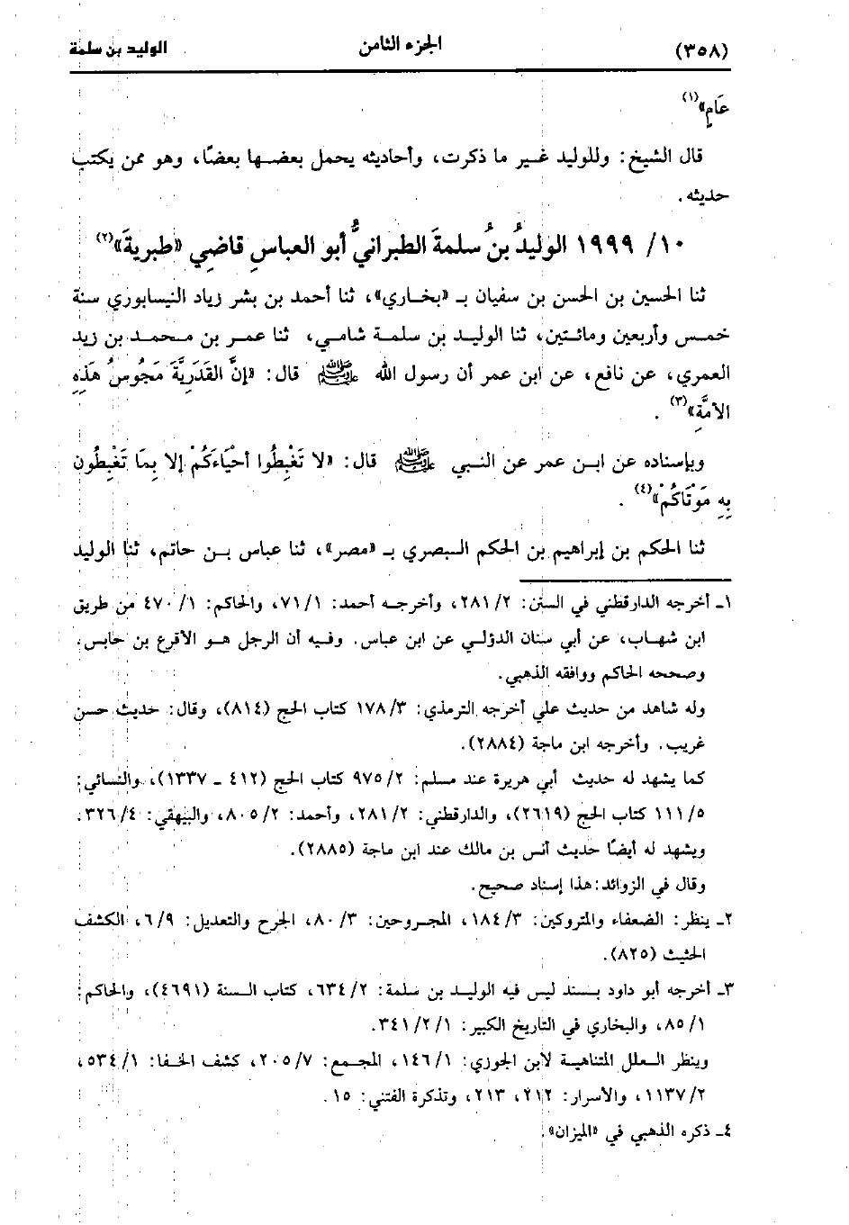 حَدَّثَنَا الْحُسَيْنُ بْنُ الْحَسَنِ بْنِ سفيان ببخارى، حَدَّثَنا أَحْمَدُ بْنُ بِشْرِ بْنِ زِيَادٍ النيسابوري سنة خمس وأربعين ومِئَتَين، حَدَّثَنا الوليد بن سلمة شامي، حَدَّثَنا عُمَر بْنُ مُحَمد بْنِ زَيْدٍ العُمَريّ عَنْ نَافِعٍ، عنِ ابْنِ عُمَر، أَن رسُول اللَّهِ صَلَّى اللَّهُ عَلَيهِ وَسلَّمَ، قَال: إِنَّ الْقَدَرِيَّةَ مَجُوسُ هَذِهِ الأُمَّةِ.