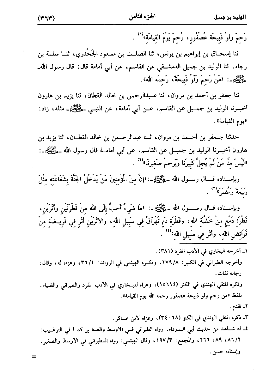حَدَّثَنَا جَعْفَرُ بْنُ أَحْمَدَ بْنِ مَرَوَانَ، حَدَّثَنا عَبد الرَّحْمَنِ بْن خالد الْقَطَّانُ، حَدَّثَنا يَزِيدُ بْنُ هَارُونَ، أَخْبَرنا الْوَلِيدُ بْنُ جَمِيلٍ، عَنِ الْقَاسِمِ، عَن أَبِي أُمَامَةَ قَال رَسُول اللهِ صَلَّى اللَّهُ عَلَيهِ وَسلَّمَ لَيْسَ مِنَّا مَنْ لَمْ يُجِلَّ كَبِيرَنَا وَيَرْحَمْ صَغِيرَنَا.