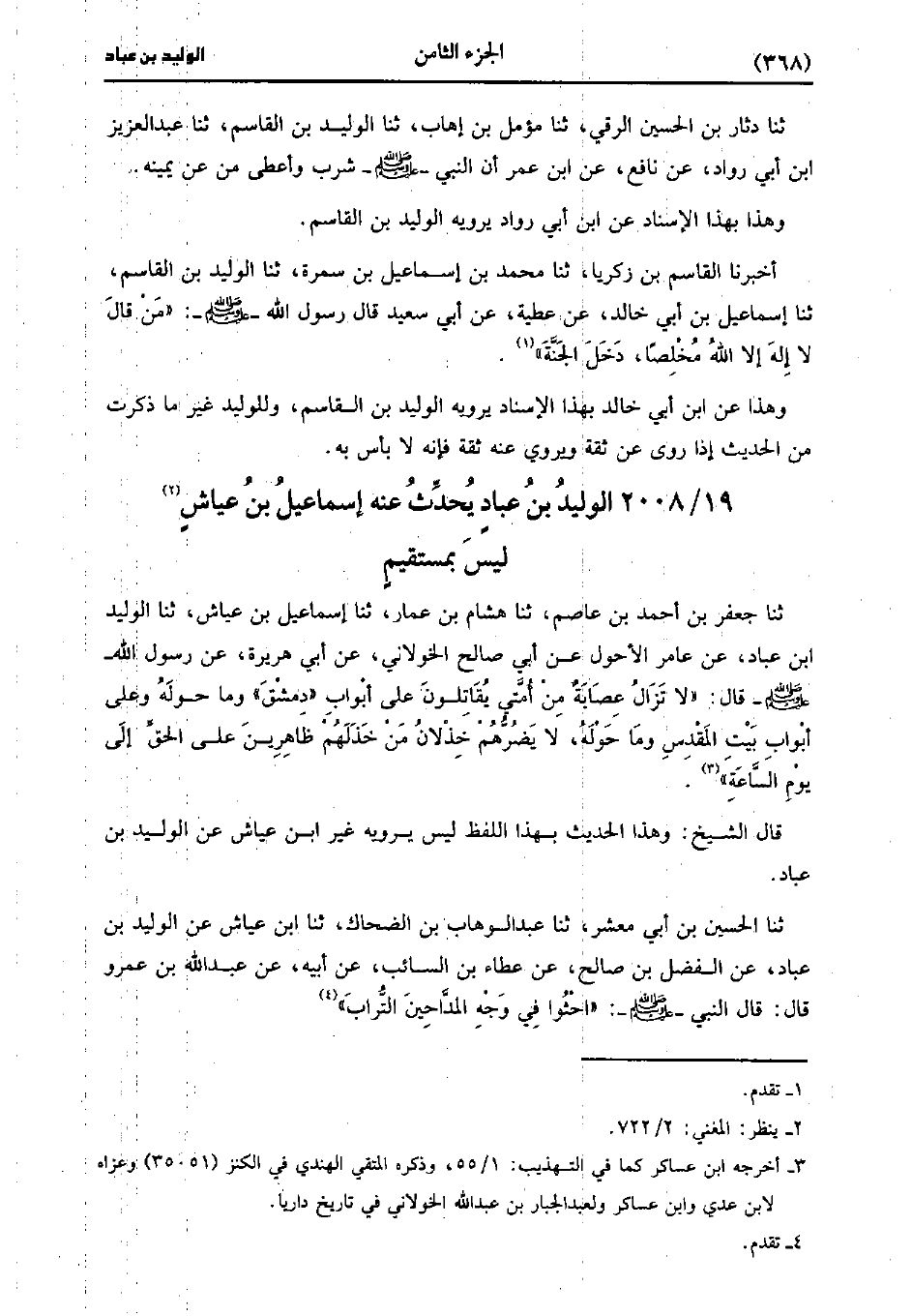 2008- الوليد بْن عباد يحدث عَنْهُ إِسْمَاعِيل بن عياش ليس بمستقيم.
