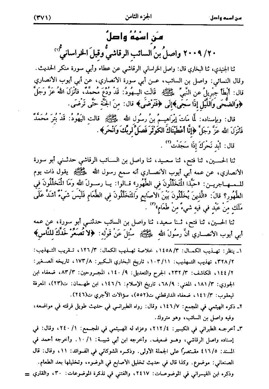 حَدَّثَنَا الجنيدي، حَدَّثَنا البُخارِيّ قال واصل الخراساني الرقاشي عن عَطَاء وأبي سورة منكر الحديث وَقَالَ النِّسَائِيُّ وَاصِلُ بْنُ السَّائِبِ، عَن أَبِي سَوْرَةَ الأَنْصَارِيِّ، عَن أَبِي أَيُّوبَ الأَنْصَارِيِّ قَالَ أَبْطَأَ جِبْرِيلُ عَنِ النَّبِيِّ صَلَّى اللَّهُ عَلَيهِ وَسلَّمَ قَالَتِ الْيَهُودُ قَدْ وُدِّعَ مُحَمد فَأَنْزَلَ اللَّهُ عَزَّ وَجَلَّ والضحى والليل إذا سجى إلى فترضى قَالَ مِنَ الْجَنَّةِ حَتَّى تَرْضَى.