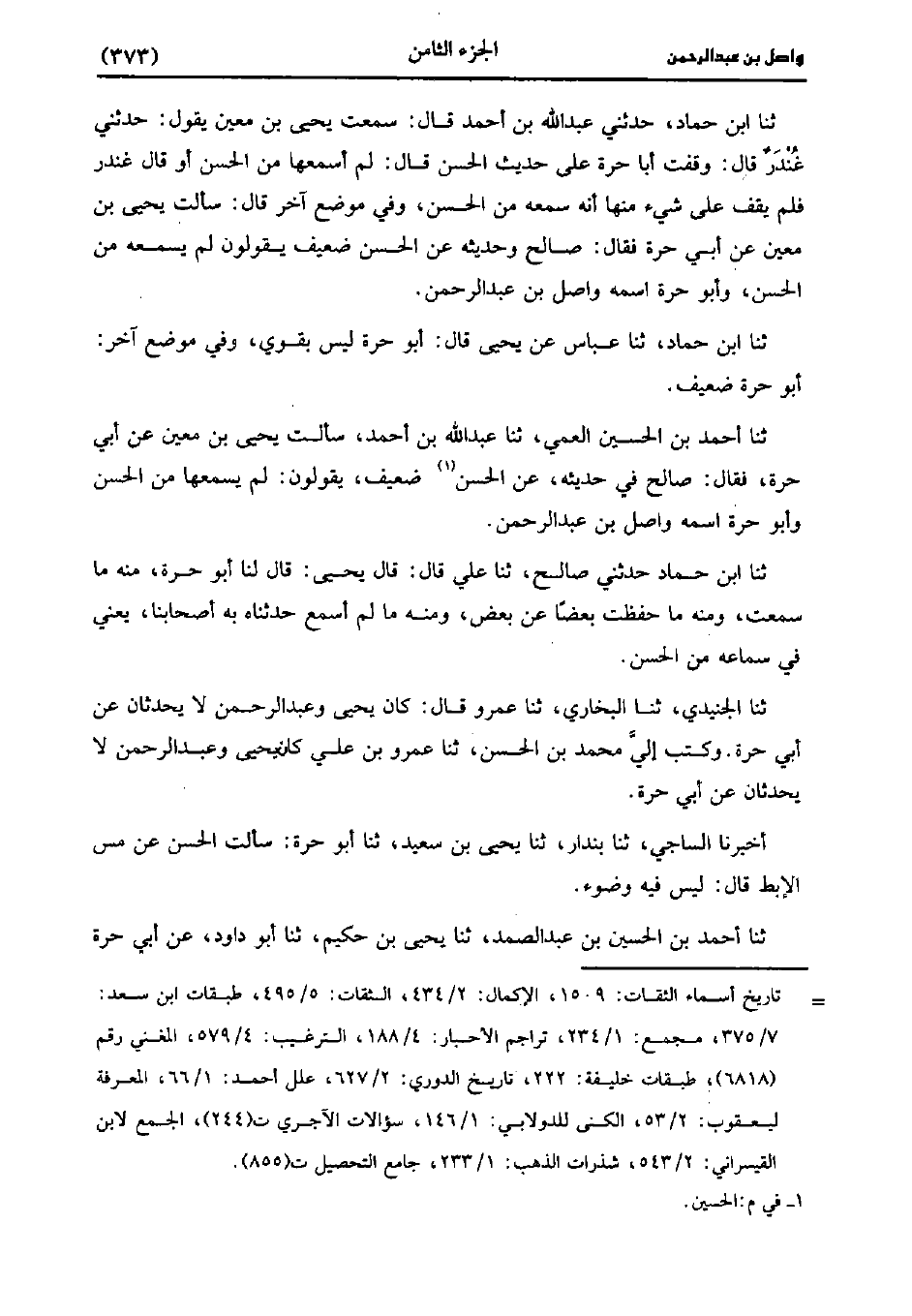 وفي موضعٍ آخر، قالَ: سَألتُ يَحْيى بْن مَعِين، عَن أَبِي حُرَّة فَقَالَ صَالِح وحديثه عن الحسن ضعيف يقولون لم يسمعه من الحسن، وأَبُو حُرَّة اسمه واصل بْنُ عَبد الرَّحْمَنِ.