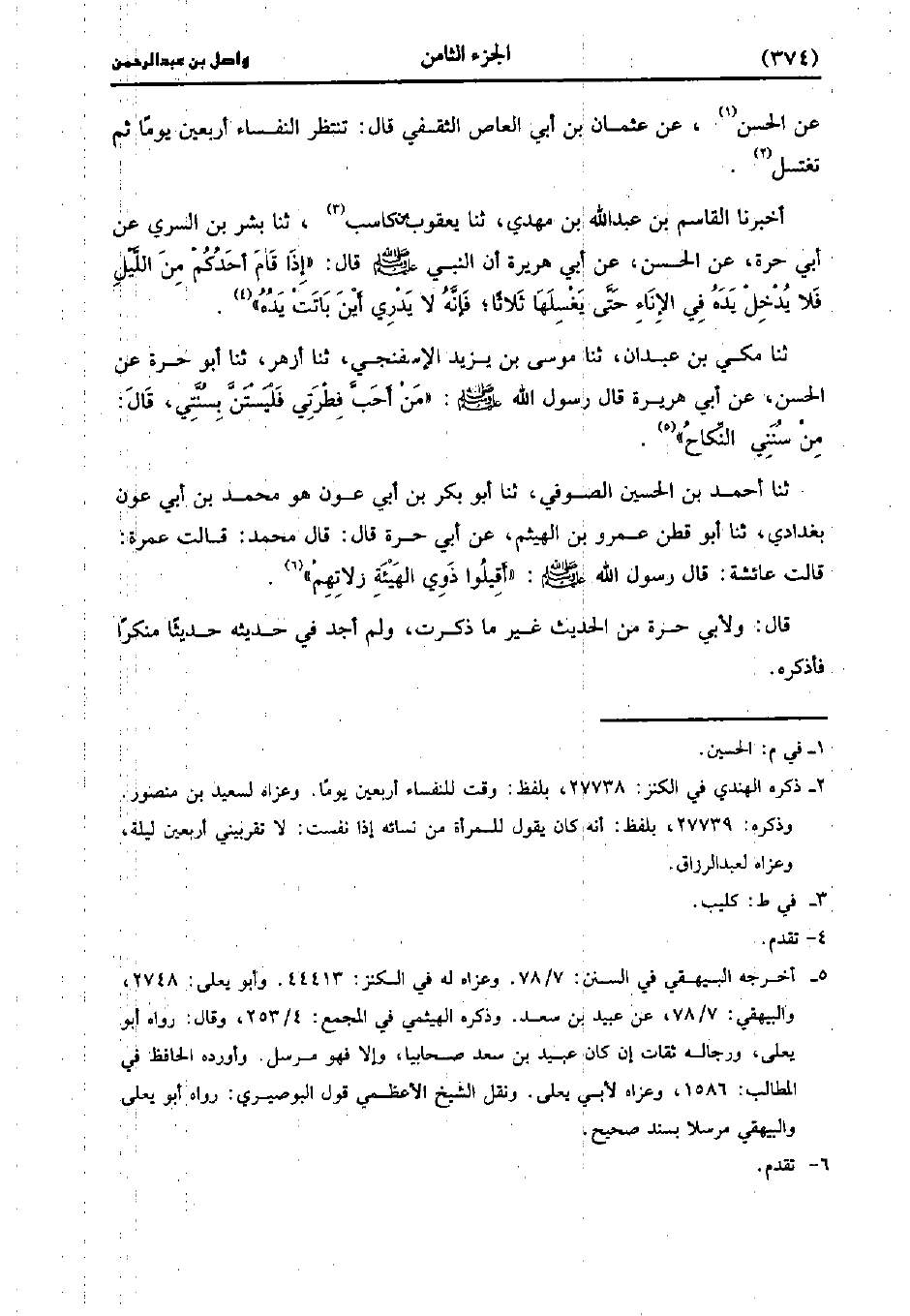 حَدَّثَنَا مَكِّيُّ بْنُ عَبْدَانَ، حَدَّثَنا موسى بن يزيد الاسفنجي، حَدَّثَنا ازهر، حَدَّثَنا أَبُو حُرَّة عَنِ الْحَسَنِ، عَن أَبِي هُرَيْرَةَ قَال رَسُول اللهِ صَلَّى اللَّهُ عَلَيهِ وَسلَّمَ مِنَ أَحَبَّ فِطْرَتِي فَلْيَسْتَنَّ بِسُنَّتِي قَالَ من سنني النكاح.
