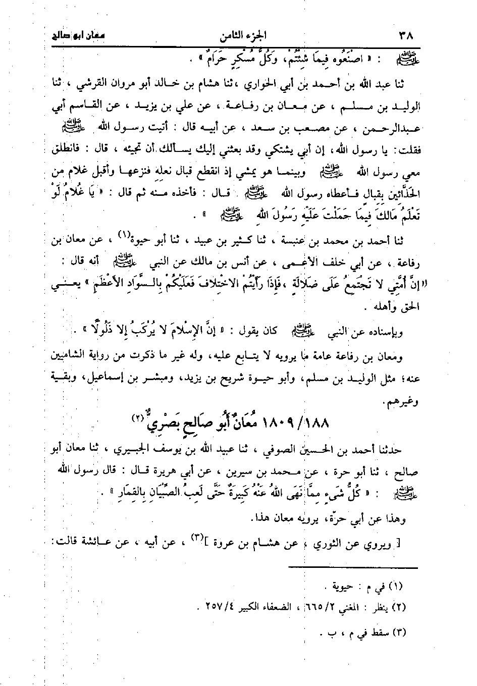 حَدَّثَنَا أَحْمَدُ بن الحسين الصُّوفيّ، حَدَّثَنا عُبَيد اللَّهِ بْنُ يُوسُفَ الجبيري، حَدَّثَنا معان أبو صالح، حَدَّثَنا أَبُو حُرَّة عَنْ مُحَمد بْنِ سِيرِين، عَن أَبِي هُرَيْرَةَ، قَال: قَال رَسُولُ اللَّهِ صَلَّى اللَّهُ عَلَيْهِ وَسَلَّمَ كُلُّ شَيْءٍ مِمَّا نَهَى اللَّهُ عَنْهُ كَبِيرَةٌ حَتَّى لَعِبُ الصِّبْيَانِ بِالْقُمَارِ.