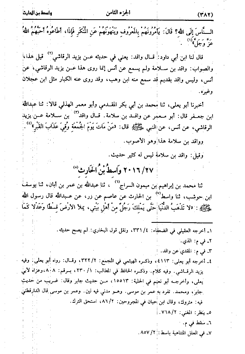 حَدَّثَنَا أَبُو يَعْلَى، حَدَّثَنا مُحَمد بْنُ أَبِي بَكْرٍ الْمُقَدَّمِيُّ، وأَبُو مَعْمَرٍ الهذلي، قَالا: حَدَّثَنا عَبد اللَّهِ بْنُ جَعْفَرٍ قَالَ أَبُو مَعْمَرٍ عَنْ وَاقِدِ بْنِ سَلامَةَ قَالَ الْوَاقِدُ بْن سلامة عن يَزِيد الرقاشي، عَن أَنَس عَنِ النَّبِيِّ صَلَّى اللَّهُ عَلَيهِ وَسلَّمَ مَنْ مَاتَ يَوْمَ الْجُمُعَةِ وُقِيَ عَذَابَ الْقَبْرِ.