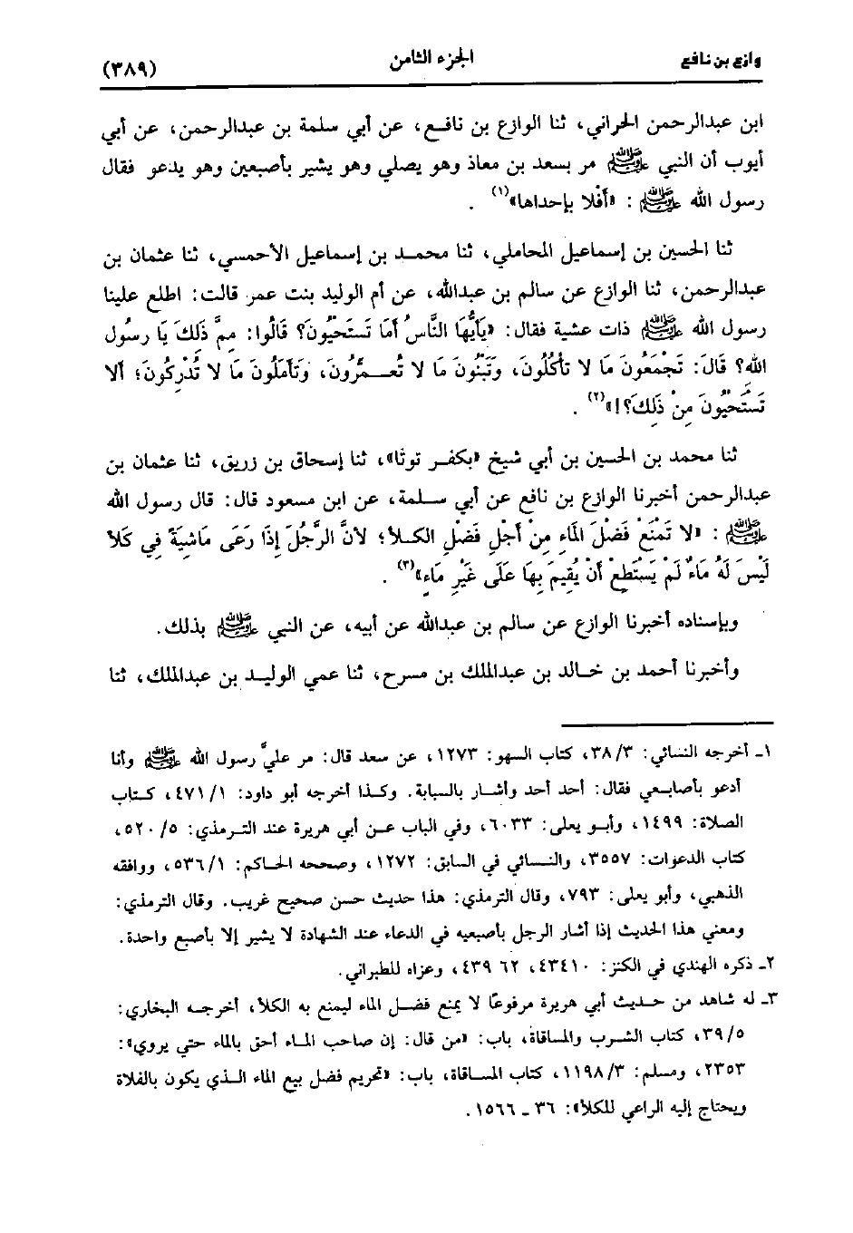 بْنُ عَبد الرَّحْمَنِ الْحَرَّانِيُّ، حَدَّثَنا الْوَازِعِ بْنِ نَافِعٍ، عَن أَبِي سَلَمَةَ بْنِ عَبد الرَّحْمَنِ، عَن أَبِي أَيُّوبَ، أَن النَّبيّ صَلَّى اللَّهُ عَلَيهِ وَسلَّمَ مَرَّ بِسَعْدِ بْنِ مُعَاذٍ، وَهو يُصَلِّي، وَهو يُشِيرُ بِأُصْبَعَيْنِ، وَهو يَدْعُو فَقَالَ رَسُولِ اللَّهِ صَلَّى اللَّهُ عَلَيْهِ وَسَلَّمَ أفلاء بأحذية.