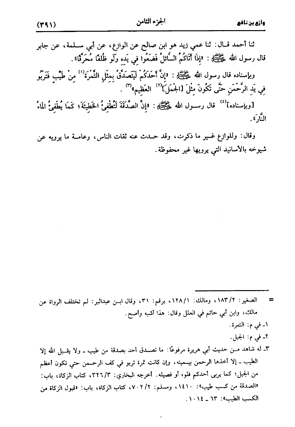 ، حَدَّثَنا أحمد، قَال: حَدَّثَنا عمي زيد هو بْنُ صَالِحٍ، عَنِ الْوَازِعِ، عَن أَبِي سَلَمَةَ، عَنْ جَابِرٍ قَال رَسُول اللهِ صَلَّى اللَّهُ عَلَيهِ وَسلَّمَ إِذَا أَتَاكُمُ السَّائِلُ فَضَعُوا فِي يَدِهِ وَلَوْ ظُلْفًا مُحَرَّقًا.