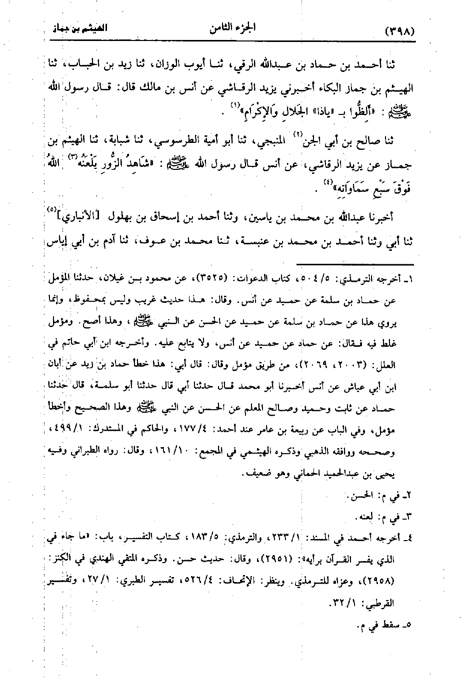 ، حَدَّثَنا أحمد بن حماد بن عَبد الله الرقي، حَدَّثَنا أيوب الوزان، حَدَّثَنا زيد بن الحباب، حَدَّثَنا الْهَيْثَمُ بْنُ جَمَّازٍ الْبَكَّاءُ أَخْبَرَنِي يَزِيدَ الرَّقَاشِيِّ، عَن أَنَس بْنِ مَالِكٍ، قَال: قَال رَسُولُ اللَّهِ صَلَّى اللَّهُ عَلَيْهِ وَسَلَّمَ أَلِظُّوا بذي الجلال والإكرام.