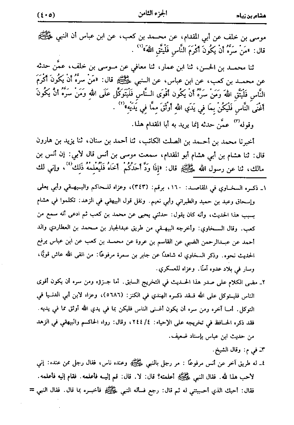 حَدَّثَنَا مُحَمد بْن الْحَسَن، حَدَّثَنا ابن عمار، حَدَّثَنا مُعَافَى عَنْ مُوسَى بْنِ خَلَفٍ عَمَّن حَدَّثَهُ عَنْ مُحَمد بْنِ كَعْبٍ، عنِ ابْنِ عَبَّاسٍ عَنِ النَّبِيِّ صَلَّى اللَّهُ عَلَيه وسَلَّم قَال: مَنْ سَرَّهُ أَنْ يَكُونَ أَكْرَمَ النَّاسِ فَلْيَتَّقِ اللَّهَ، ومَنْ سَرَّهُ أَنْ يَكُونَ أَقْوَى النَّاسِ فَلْيَتَوَكَّلْ عَلَى اللَّهِ، ومَنْ سَرَّهُ أَنْ يَكُونَ أَغْنَى النَّاسِ فَلْيَكُنْ بِمَا فِي يَدَيِ اللَّهِ أَوْثَقُ مِمَّا فِي يَدَيْهِ.