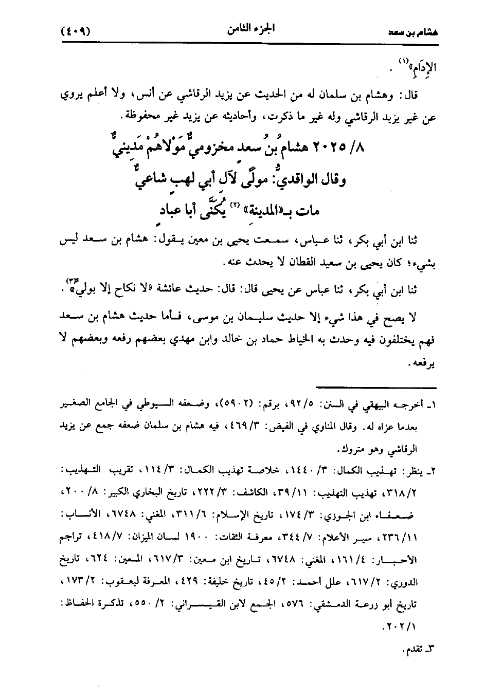 2025- هشام بْن سعد مخزومي مولاهم مديني وَقَالَ الواقدي مولى لآل أبي لهب شاعي مات بالمدينة، يُكَنَّى أبا عباد.