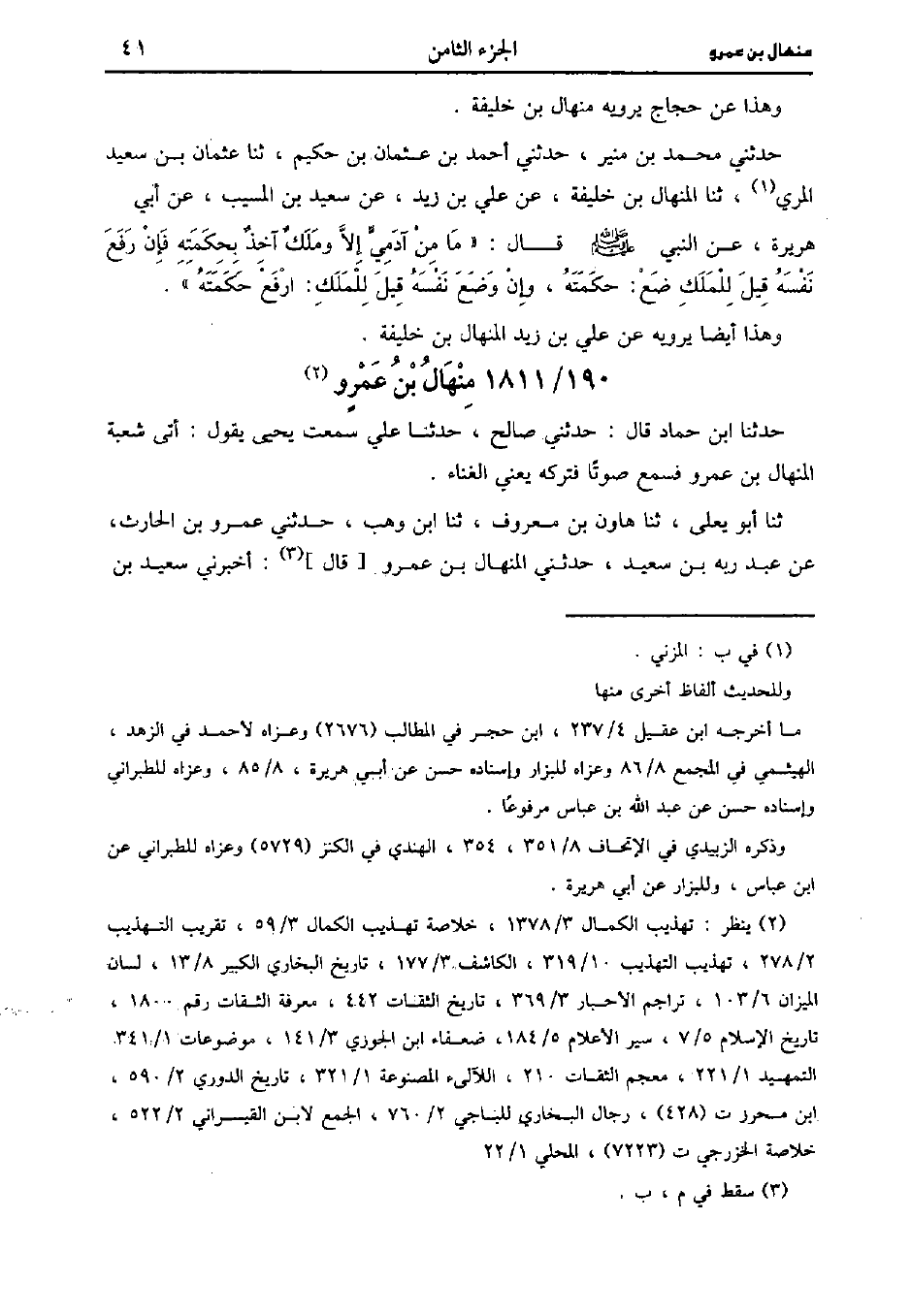 حَدَّثني مُحَمد بْنُ مُنِيرٍ، حَدَّثني أَحْمَدُ بْنُ عُثْمَانَ بْنُ حَكِيمٍ، حَدَّثَنا عُثْمَانُ بْنُ سَعِيد المري، حَدَّثَنا الْمِنْهَالُ بْنُ خَلِيفَةَ، عَن عَلِيِّ بْنُ زَيْدٍ عَنْ سَعِيد بْنِ المُسَيَّب، عَن أَبِي هُرَيْرَةَ عَنِ النَّبِيُّ صَلَّى اللَّهُ عَلَيه وسَلَّم قَال: مَا مِنْ آدَمِيٍّ إلاَّ وَمَلَكٌ آخِذٌ بِحِكَمَتِهِ فَإِنْ رَفَعَ نَفْسَهُ قِيلَ لِلْمَلَكِ ضَعْ حَكَمَتَهُ وَإِنْ وَضَعَ نَفْسَهُ قِيلَ لِلْمَلَكِ ارْفَعْ حَكَمَتَهُ.
