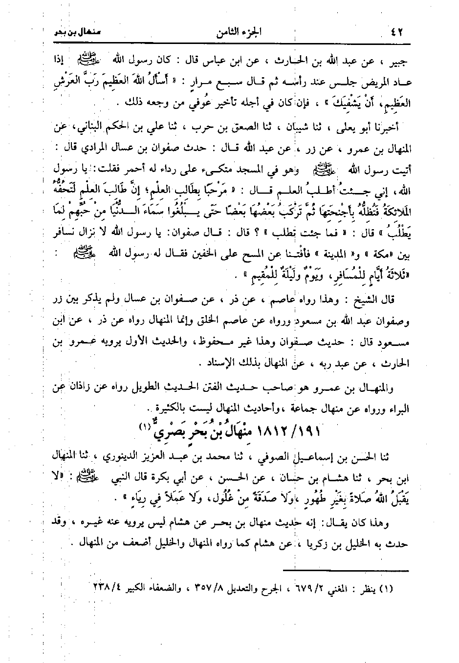 حَدَّثَنَا أبو يعلى، حَدَّثَنا شيبان، حَدَّثَنا الصعق بْنِ حَرْبٍ، حَدَّثَنا عَلِيُّ بْنُ الْحَكَمِ الْبُنَانِيُّ عَنِ الْمِنْهَالِ بْنِ عَمْرو عَنْ زَرٍّ عَنْ عَبد اللَّهِ قَالَ حَدَّثَ صَفْوَانُ بْنُ عَسَّالٍ الْمُرَادِيُّ قَالَ أَتَيْتُ رَسُولَ اللَّهِ صَلَّى اللَّهُ عَلَيْهِ وَسَلَّمَ، وَهو فِي الْمَسْجِدِ مُتَّكِئٌ عَلَى رِدَاءٍ لَهُ أَحْمَرَ فَقُلْتُ يَا رَسُولَ اللهِ إِنِّي جِئْتُ أَطْلُبُ الْعِلْمَ قَالَ مَرْحَبًا بِطَالِبِ الْعِلْمِ إِنَّ طَالِبَ الْعِلْمِ لَتَحُفُّهُ الْمَلائِكَةُ فَتُظِلُّهُ بِأَجْنِحَتِهَا ثُمَّ تَرْكَبُ بَعْضُهَا بَعْضًا حَتَّى يَبْلُغُوا سَمَاءَ الدُّنْيَا مُنْ حُبِّهِمْ لِمَا يَطْلُبُ قَالَ فَمَا جِئْتَ تَطْلُبُ، قَال: قَال صَفْوَانُ يَا رَسُولَ اللهِ لا نَزَالُ نُسَافِرُ بَيْنَ مَكَّةَ وَالْمَدِينَةِ فَأَفْتِنَا عَنِ الْمَسْحِ عَلَى الْخُفَّيْنِ فَقَالَ لَهُ رَسُولُ اللَّهِ صَلَّى اللَّهُ عَلَيْهِ وَسَلَّمَ ثَلاثَةُ أَيَّامٍ لِلْمُسَافِرِ وَيَوْمٌ وَلَيْلَةٌ لِلْمُقِيمِ.