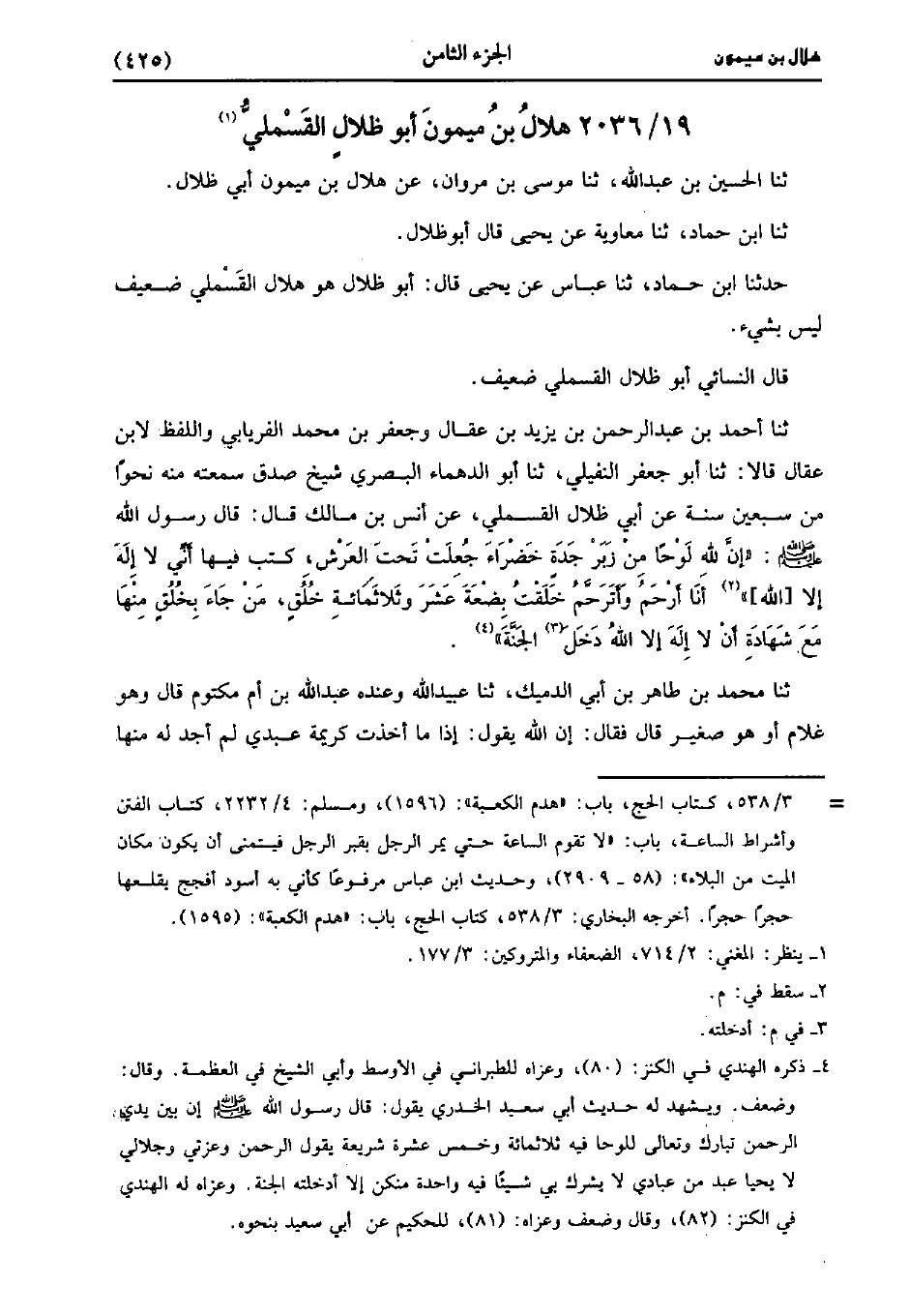 حَدَّثَنَا ابن حماد، حَدَّثَنا عباس، عَن يَحْيى، قَالَ أَبُو ظلال هو هلال القسملي ضعيف ليس بشَيْءٍ.