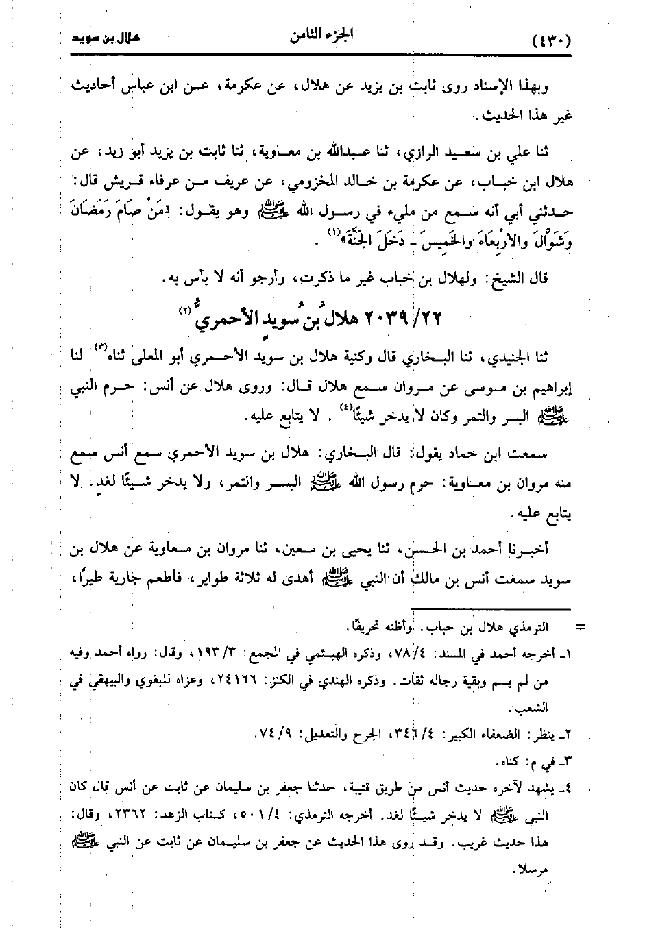 حَدَّثَنَا الجنيدي، حَدَّثَنا البُخارِيّ قال وكنية هلال بْن سُوَيْد الأحمري أبو المعلى حَدَّثَنَاهُ لنا إِبْرَاهِيم بْن مُوسَى عن مروان سمع هلال قَالَ وروى هلال، عَن أَنَس حرم النَّبِيّ صَلَّى اللَّهُ عَلَيهِ وَسلَّمَ البسر والتمر وكان لا يدخر شيئا، لاَ يُتَابَعُ عَليه.