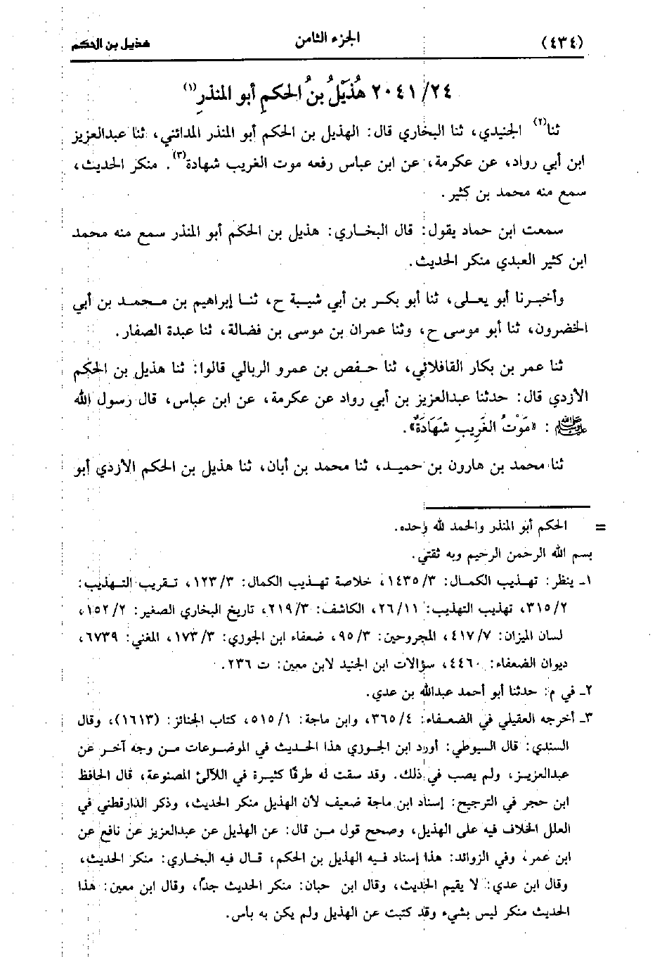 حَدَّثَنَا الجنيدي، حَدَّثَنا البُخارِيّ قال الْهُذَيْلُ بْنُ الْحَكَمِ أَبُو الْمُنْذِرِ المدائني، حَدَّثَنا عَبد الْعَزِيزِ بْنِ أَبِي رَوَّاد، عَنْ عِكرمَة، عنِ ابْنِ عَبَّاسٍ رفعه موت الغريب شهادة منكر الحديث سمع منه مُحَمد بْن كثير.