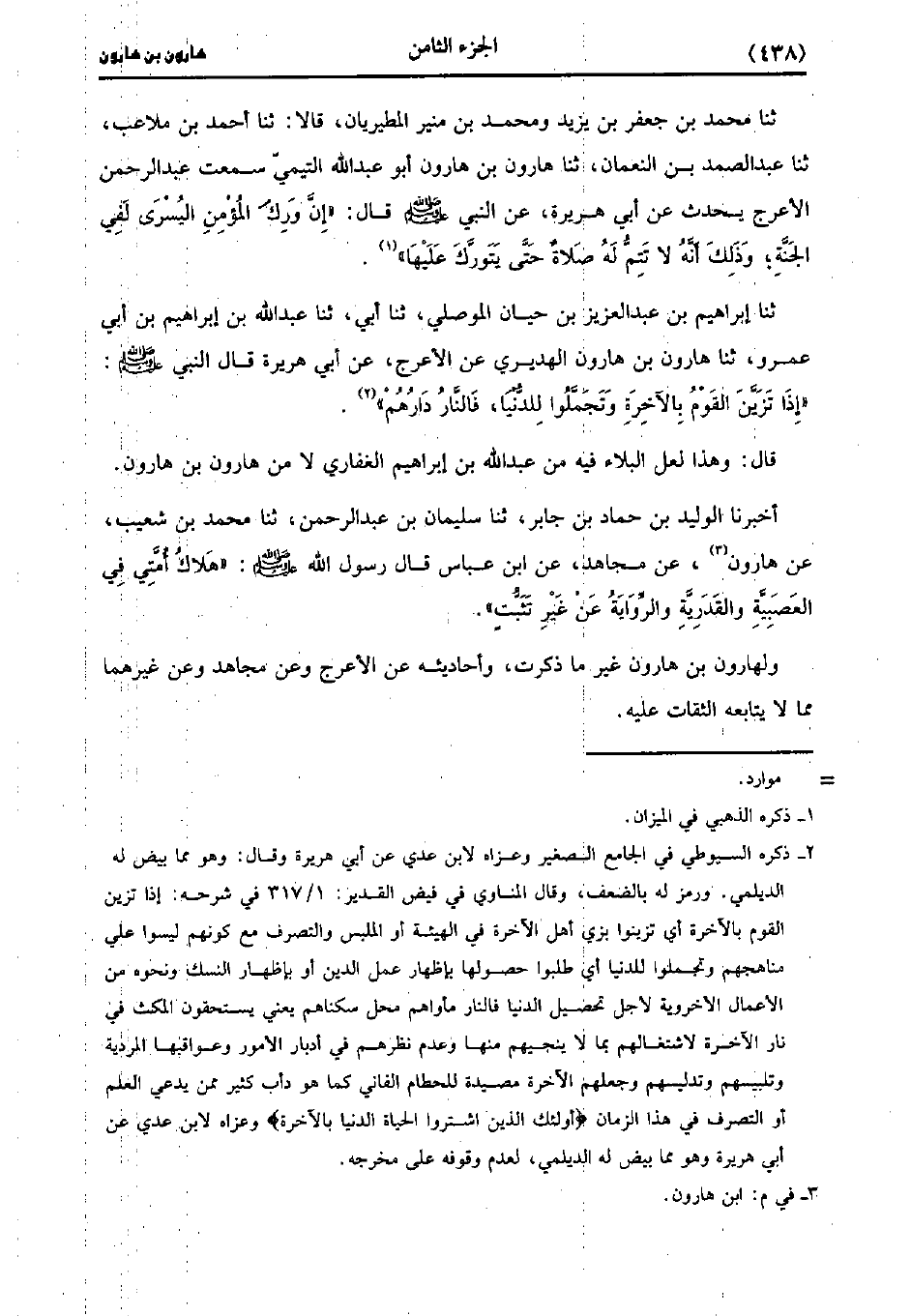 حَدَّثَنَا الْوَلِيدُ بْنُ حَمَّادِ بْنِ جَابِرٍ، حَدَّثَنا سُلَيْمَانُ بْنُ عَبد الرَّحْمَنِ، حَدَّثَنا مُحَمد بْنُ شُعَيب عَنْ هَارُونَ عَنْ مُجَاهِدٍ، عنِ ابْنِ عَبَّاسٍ قَال رَسُول اللهِ صَلَّى اللَّهُ عَلَيهِ وَسلَّمَ هَلاكُ أُمَّتِي فِي الْعَصَبِيَّةِ وَالْقَدَرِيَّةِ وَالرِّوَايَةِ عَنْ غَيْرِ تَثَبُّتٍ.