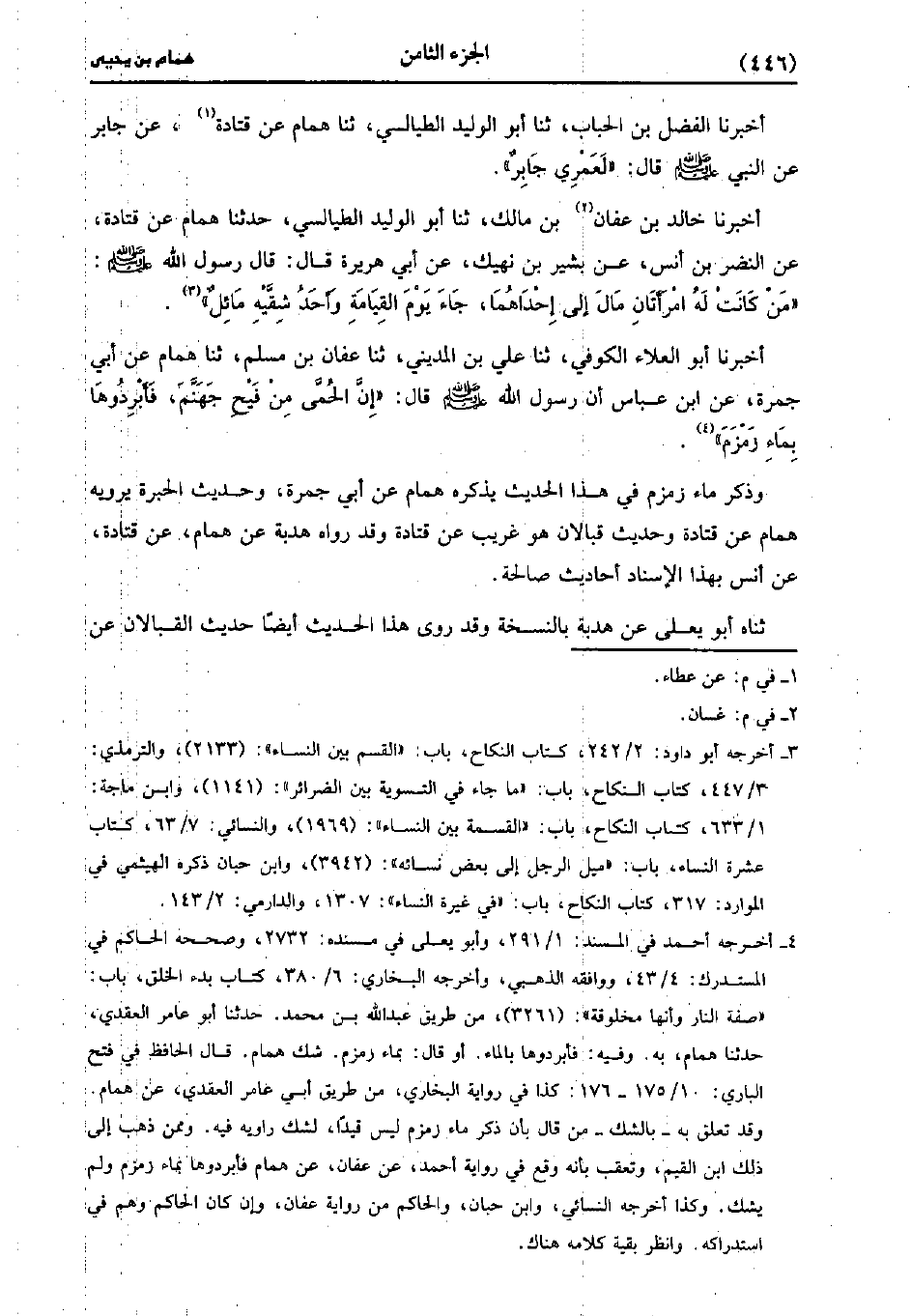 حَدَّثَنَا خَالِدُ بْنُ عَفَّانَ بْنِ مَالِكٍ، حَدَّثَنا أَبُو الْوَلِيدِ الطَّيَالِسِيُّ، حَدَّثَنا هَمَّامٌ، عَن قَتادَة عَنِ النَّضْرِ بْنِ أَنَسٍ عَنْ بَشِيرِ بْنِ نَهِيْكٍ، عَن أَبِي هُرَيْرَةَ، قَال: قَال رَسُولِ اللَّهِ صَلَّى اللَّهُ عَلَيْهِ وَسَلَّمَ مَنْ كَانَتْ لَهُ امْرَأَتَانِ مَالَ إِلَى إِحْدَاهُمَا جَاءَ يَوْمَ القيامة وأحد شقيه مائل.