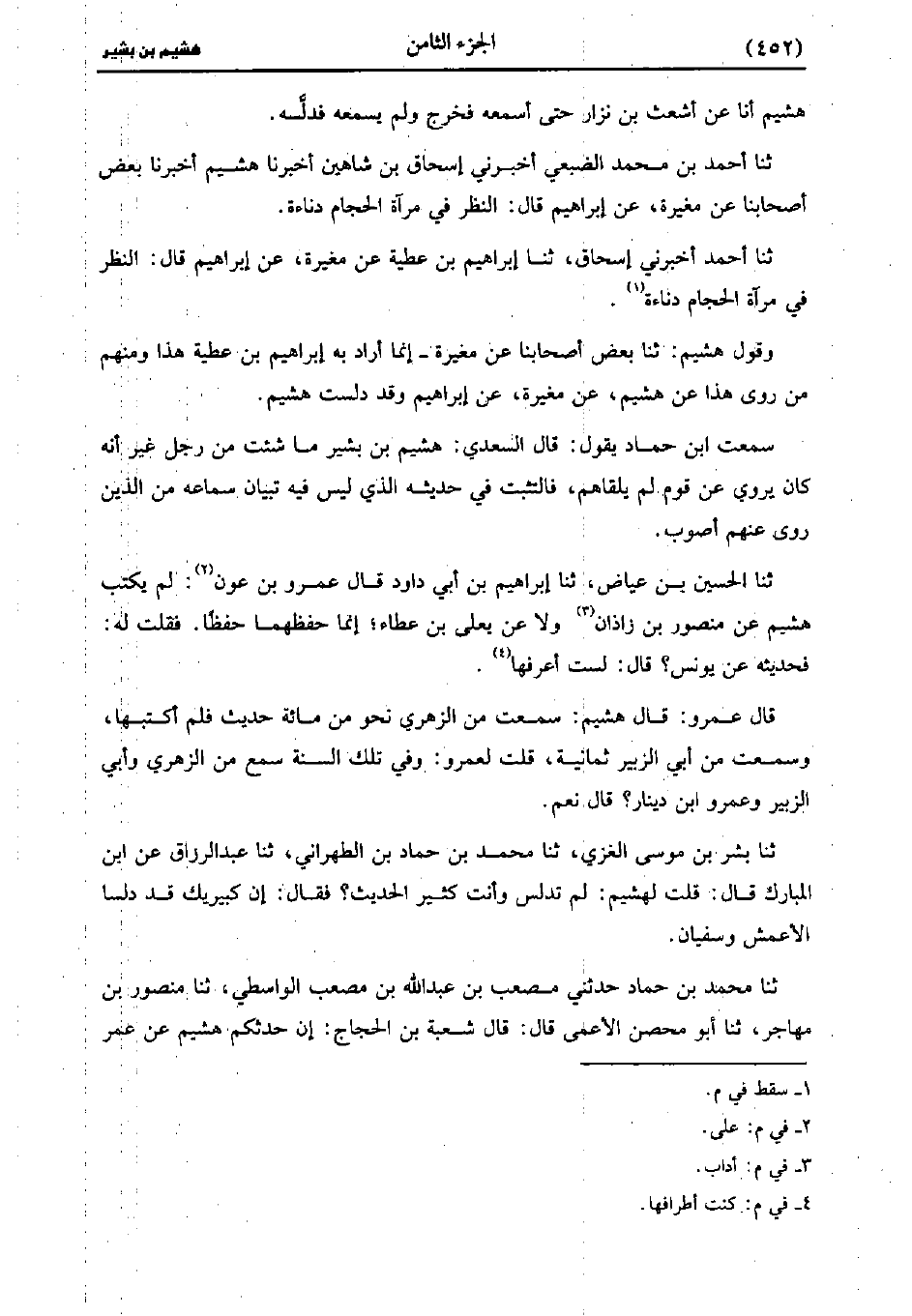 قال عَمْرو قَالَ هشيم سَمِعت من الزُّهْريّ نحو من مِئَة حديث فلم أكتبها وسمعت من أبي الزُّبَيْر ثمانية قلت لعمرو وفي تلك السنة سمع من الزُّهْريّ وأبي الزُّبَيْر، وعَمْرو بْن دينار؟ قَال: نَعم.