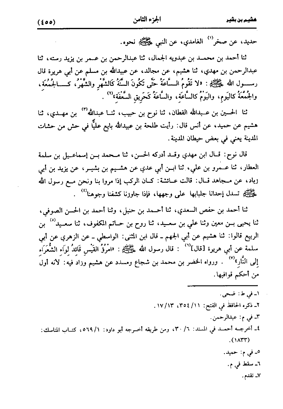 حَدَّثَنَا أَحْمَدُ بْنُ حَفْصٍ السَّعْدِيُّ، حَدَّثَنا أَحْمَدُ بْنُ حَنْبَلٍ وَحَدَّثنا أَحْمَدُ بْنُ الْحَسَنِ الصُّوفيّ، حَدَّثَنا يَحْيى بْنُ مَعِين وَحَدَّثنا عَلِيُّ بْنُ سَعِيد، حَدَّثَنا رَوْحُ بْنُ حاتم المكفوف، حَدَّثَنا سَعِيد بْنُ الرَّبِيعِ قَالُوا، حَدَّثَنا هُشَيْمٌ، عَن أَبِي الْجَهْمِ قَالَ ابْنُ الْمُثَنَّى الْوَاسِطِيُّ، عنِ الزُّهْريّ، عَن أَبِي سَلَمَةَ، عَن أَبِي هُرَيْرَةَ، قَال: قَال رَسُولُ اللَّهِ صَلَّى اللَّهُ عَلَيْهِ وَسَلَّمَ امْرِؤُ الْقَيْسِ قَائِدُ لِوَاءِ الشُّعَرَاءِ إِلَى النَّارِ ورواه الخضر بْن مُحَمد بْن شجاع ومسدد عن هشيم وزاد فيه لأنه أول من أحكم قوافيها