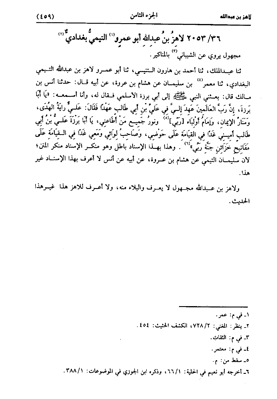 حَدَّثَنَا عَبد الْمَلِكِ، حَدَّثَنا أَحْمَدُ بْنُ هارون التنيسي، حَدَّثَنا أَبُو عَمْرو لاهِزُ بْنُ عَبد الله التيمى البغدادي، حَدَّثَنا مُعَمَّر بْنُ سُليمان عَنْ هِشَامِ بْنِ عُرْوَةَ، عَنْ أَبِيهِ، قَال: حَدَّثَنا أَنَسُ بْنُ مَالِكٍ قَالَ بَعَثَنِي النَّبِيُّ صَلَّى اللَّهُ عَلَيهِ وَسلَّمَ إِلَى أَبِي بَرْزَةَ الأَسْلَمِيِّ فَقَالَ لَهُ وَأَنَا أَسْمَعُهُ يَا أَبَا بَرْزَةَ إِنَّ رَبَّ الْعَالَمِينَ عَهِدَ إِلَيَّ فِي عَلِيِّ بْنِ أَبِي طَالِبٍ عَهْدًا فَقَالَ عَلِيٌّ رَايَةُ الْهُدَى وَمَنَارُ الإِيمَانِ وَإِمَامُ أَوْلِيَاءِ رَبِّي وَنُورُ جَمِيعِ مَنْ أَطَاعَنِي يَا أَبَا بَرْزَةَ عَلِيُّ بْنُ أَبِي طَالِبٍ أَمِينِي غَدًا فِي الْقِيَامَةِ عَلَى حَوْضِي وَصَاحِبُ لِوَائِي وَمَعِي غَدًا فِي الْقِيَامَةِ عَلَى مَفَاتِيحِ خَزَائِنِ جَنَّةِ رَبِّي وهذا بهذا الإسناد باطل، وَهو منكر الإسناد منكر المتن لأَن سُلَيْمَان التيمي عن هِشَام بْن عُرْوَة، عن أَبِيهِ، عَن أَنَس لا أعرف بهذا الإسناد غير هذا.
