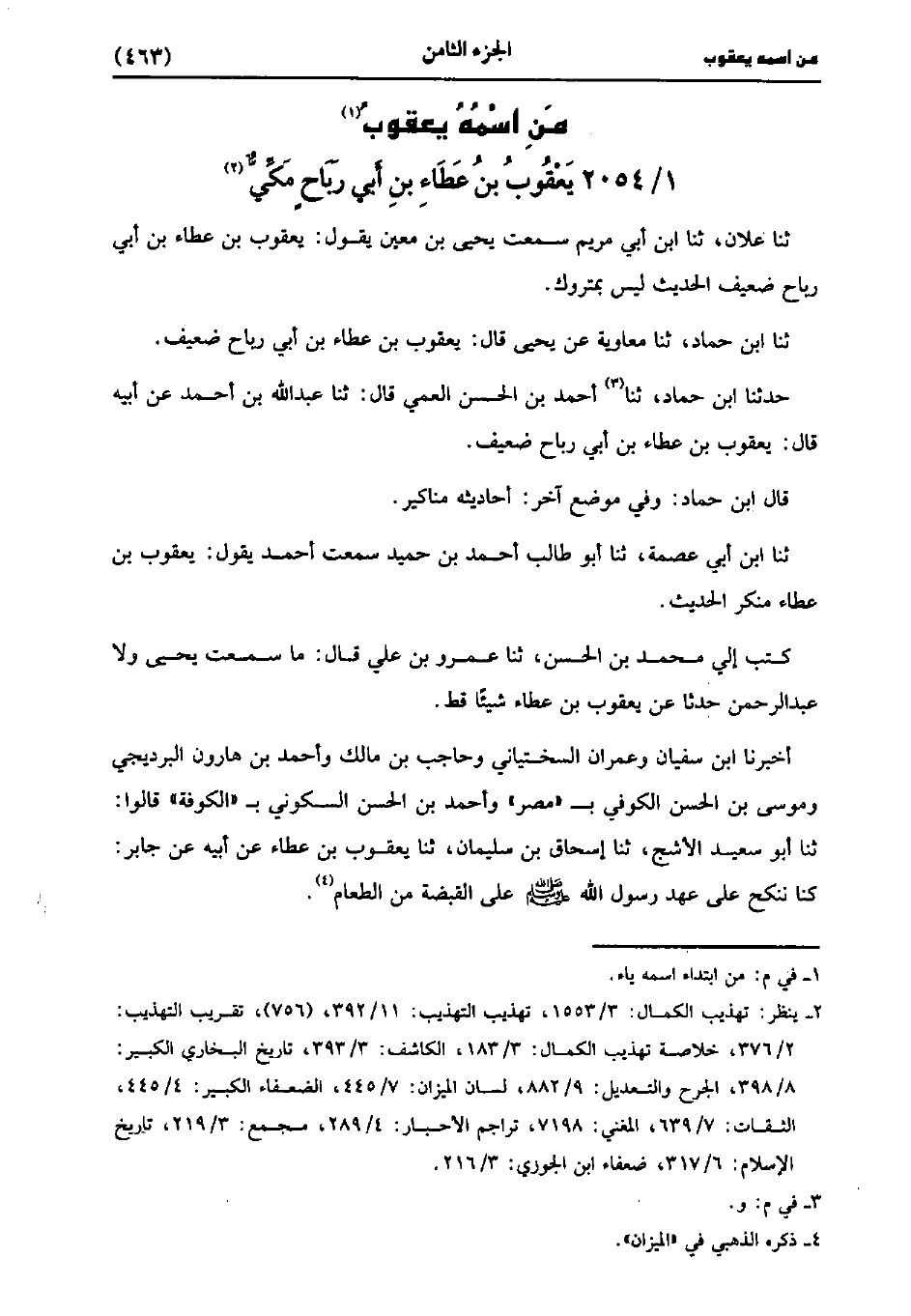حَدَّثَنَا ابن حماد، حَدَّثَنا أَحْمَد بْن الحسن العمي، قَال: حَدَّثَنا عَبد اللَّهِ بْنُ أَحْمَدَ، عن أَبِيهِ قَالَ يَعْقُوب بْن عَطَاء بْن أبي رَبَاح ضعيف.