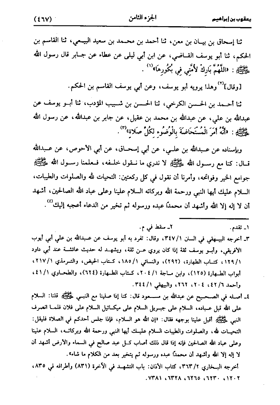 ، حَدَّثَنا إِسْحَاقُ بْنُ بَيَّانِ بْنِ مَعْنٍ، حَدَّثَنا أَحْمَدُ بْنُ مُحَمد بْنِ سَعِيد البيعي، حَدَّثَنا الْقَاسِمُ بْنُ الْحَكَمِ، حَدَّثَنا أَبُو يُوسُفَ الْقَاضِي، عنِ ابْنِ أَبِي لَيْلَى عَنْ عَطاء، عَن جَابِرٍ قَال رَسُول اللهِ صَلَّى اللَّهُ عَلَيهِ وَسلَّمَ اللَّهُمَّ بَارِكْ لأُمَّتِي فِي بُكُورِهَا.