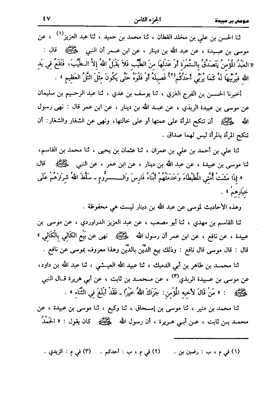 ، حَدَّثَنا الْحَسَنُ بْنُ عَلِيِّ بْنِ مخلد القطان، حَدَّثَنا مُحَمد بْنُ حَمِيدٌ، حَدَّثَنا عَبد الْعَزِيزِ عُثْمَانُ بْنُ زائِدة، عَن مُوسَى بْنِ عُبَيْدَةَ عَنْ عَبد اللَّهِ بْنِ دِينَارٍ، عنِ ابْنِ عُمَر، أَن النَّبيّ صَلَّى اللَّهُ عَلَيه وسَلَّم قَال: الْعَبْدُ الْمُؤْمِنُ يَتَصَدَّقُ بِالتَّمْرَةِ أَوْ عِدْلَهَا مِنَ الطَّيِّبِ فَلا يَقْبَلُ اللَّهُ إلاَّ الطَّيِّبَ فَتَقَعُ فِي يَدِ اللَّهِ فَيُرَبِّيهَا لَهُ كَمَا يُرَبِّي أَحَدٌ فَصِيلَهُ أَوْ فُلُوَّهُ حَتَّى يكون مثل التل العظيم.