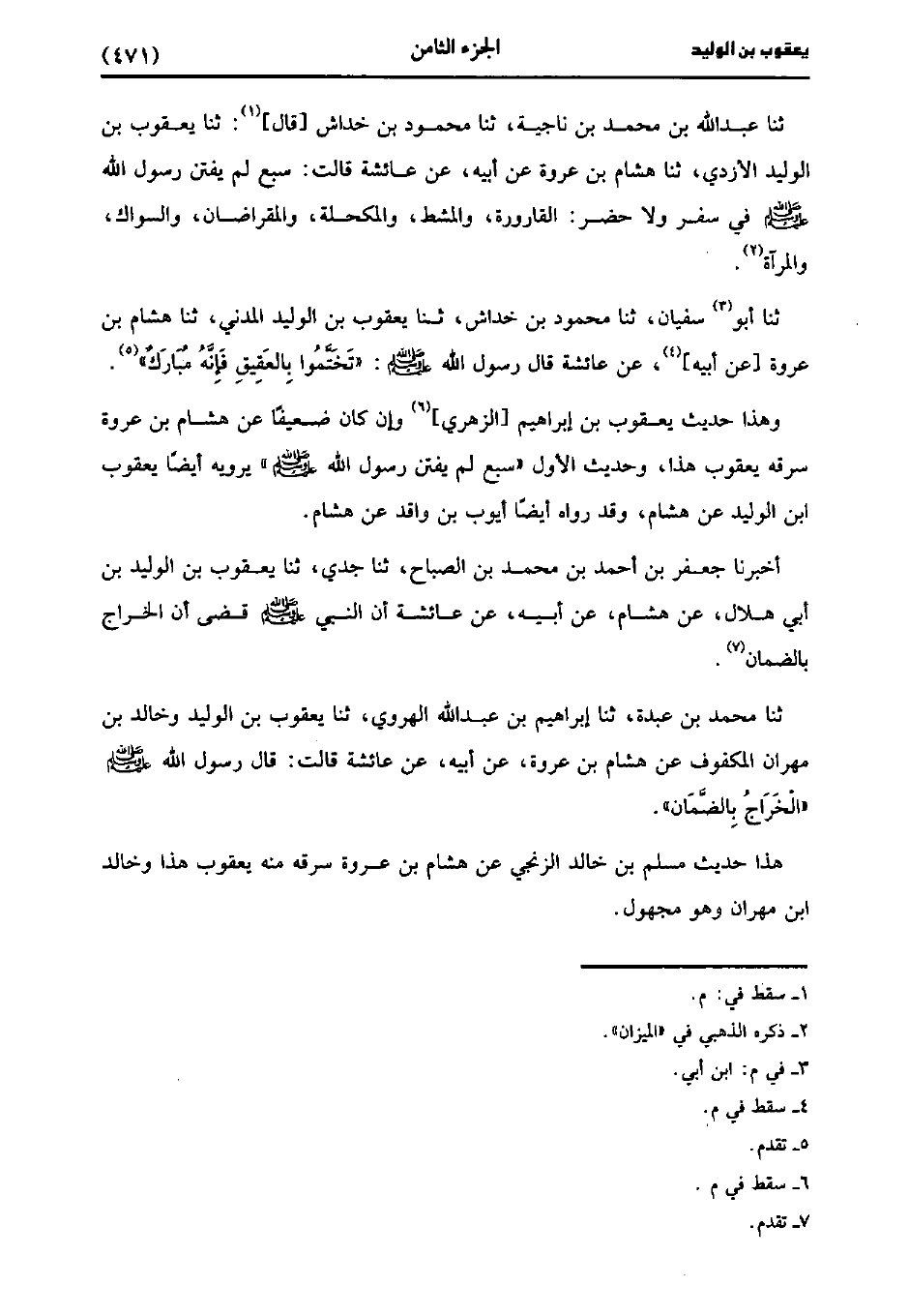 حَدَّثَنَا مُحَمد بْنُ عَبْدَةَ، حَدَّثَنا إِبْرَاهِيمُ بْنُ عَبد اللَّهِ الْهَرَوِيُّ، حَدَّثَنا يَعْقُوبُ بْنُ الْوَلِيدِ وَخَالِدُ بْنُ مَهْرَانَ الْمَكْفُوفُ عَنْ هِشَامِ بْنِ عُرْوَةَ، عَنْ أَبِيهِ عَنْ عَائِشَةَ قَالَتْ قَال رَسُول اللهِ صَلَّى اللَّهُ عَلَيهِ وَسلَّمَ الْخَرَاجُ بِالضَّمَانِ.