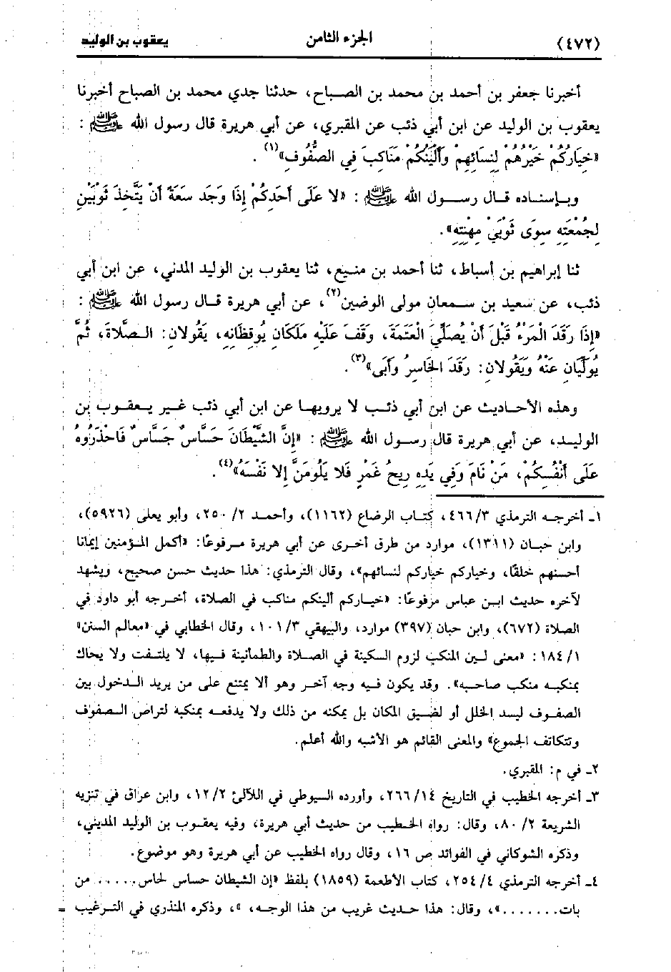 أَخْبَرنا جَعْفَرُ بْنُ أَحْمَدَ بْنِ مُحَمد بْنِ الصَّبَّاحِ، حَدَّثَنا جَدِّي مُحَمد بْنُ الصَّبَّاحِ، أَخْبَرنا يَعْقُوبُ بْنُ الْوَلِيدِ، عنِ ابْنِ أَبِي ذِئْبٍ عَنِ الْمَقْبُرِيِّ، عَن أَبِي هُرَيْرَةَ قَال رَسُول اللهِ صَلَّى اللَّهُ عَلَيهِ وَسلَّمَ خِيَارُكُمْ خَيْرُهُمْ لِنِسَائِهِمْ وَأَلْيَنُكُمْ مَنَاكِبَ فِي الصُّفُوفِ.