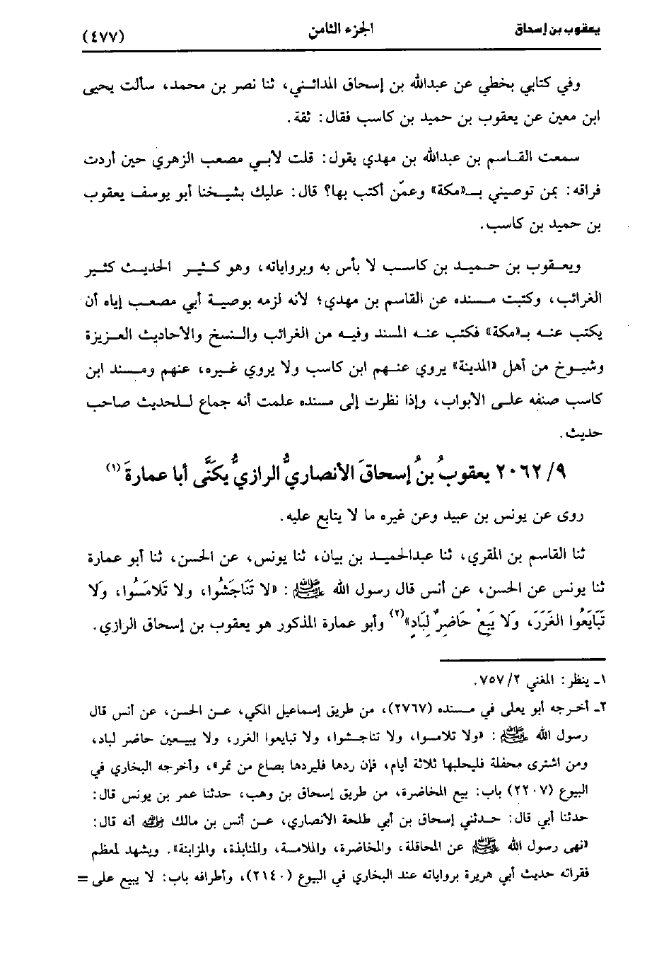 حَدَّثَنَا القاسم بن المقري، حَدَّثَنا عَبد الْحَمِيدِ بْنُ بَيَّانٍ، حَدَّثَنا يُونُس عن الحسن، حَدَّثَنا أبو عمارة، حَدَّثَنا يُونُس عَنِ الْحَسَنِ، عَن أَنَس قَال رَسُول اللهِ صَلَّى اللَّهُ عَلَيهِ وَسلَّمَ: لاَ تَنَاجَشُوا، ولاَ تَلامَسُوا، ولاَ تَبَايَعُوا الْغُرَرَ، ولاَ يَبِعْ حَاضِرٌ لِبَادٍ، وأَبُو عمارة المذكور هو يَعْقُوب بْن إِسْحَاق الرازي