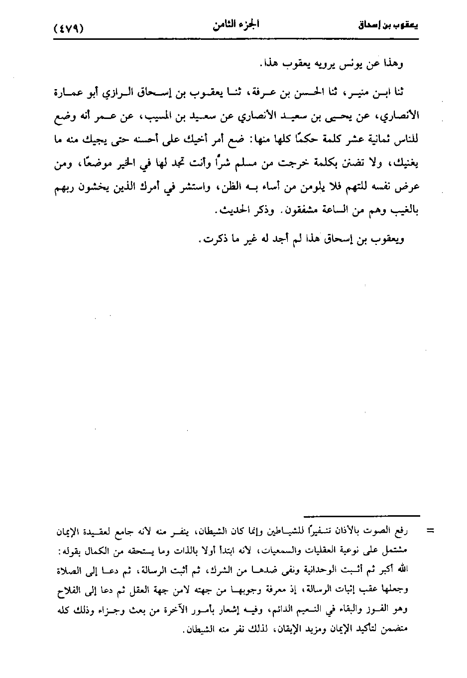 حَدَّثَنَا ابْنُ مُنِيرٍ، حَدَّثَنا الْحَسَنُ بن عرفة، حَدَّثَنا يَعْقُوب بْن إِسْحَاق الرَّازِي أَبُو عمارة الأنصاري، عَن يَحْيى بْن سَعِيد الأنصاري عن سَعِيد بْن المُسَيَّب عن عُمَر أَنَّهُ وضع للناس ثمانية عشر كلمة حكما كلها منها ضع أمر أخيك على أحسنه حَتَّى يجيك منه ما يغنيك، ولاَ تظنن بكملة خرجت من مُسْلِم شرا وأنت تجد لَهَا فِي الخير موضعا، ومَنْ عرض نفسه للتهم فلا يلومن من أساء بِهِ الظن واستشر فِي أمرك الذين يخشون ربهم بالغيب وهم من الساعة مشفقون وذكر الحديث.