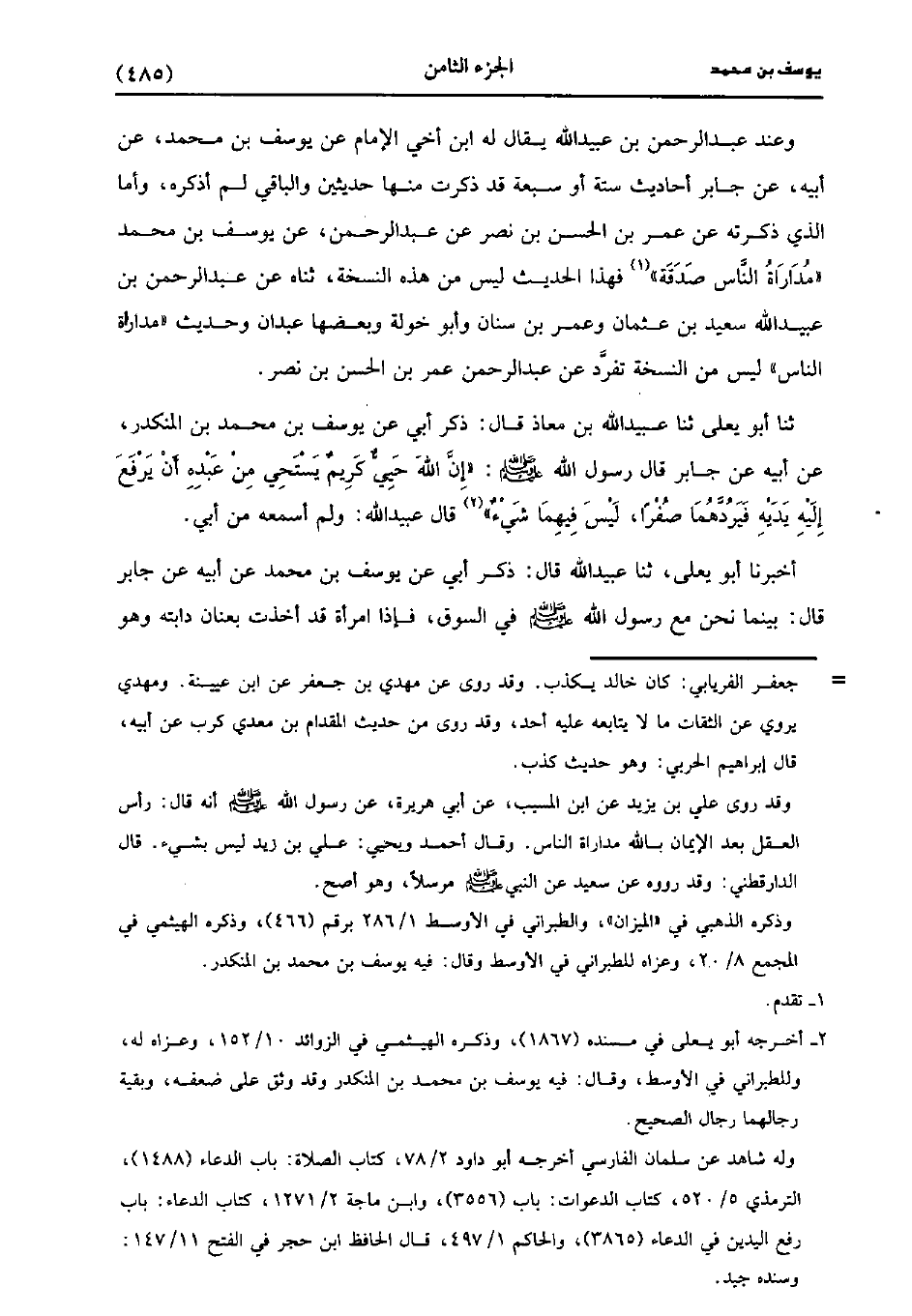 وعند عَبد الرَّحْمَن بْن عُبَيد اللَّه، يُقَال لَهُ: ابْن أخي الإمام عن يُوسُف بْن مُحَمد عن أبيهعن جَابِر أحاديث ستة أو سبعة قد ذكرت منها حديثين والباقي لم أذكره وأما الَّذِي ذكرته عن عُمَر بْن الحسن بْن نصر عن عَبد الرَّحْمَن عن يُوسُف بْن مُحَمد مداراة الناس صدقة فهذا الحديث ليس من هذه النسخة وهذه النسخة حَدَّثَنَاهُ عَنْ عَبد الرَّحْمَنِ بْنِ عُبَيد اللَّه سَعِيد بْن عُثْمَان وعمر بْن سنان، وأَبُو خولة وبعضها عبدان وحديث مداراة الناس ليس من النسخة تفرد عن عَبد الرَّحْمَن عُمَر بْن الحسن بْن نصر.