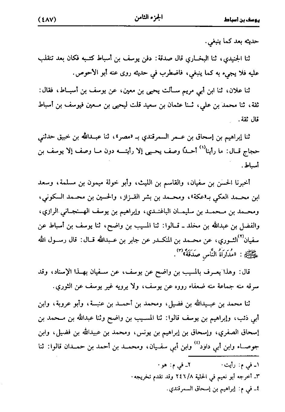 حَدَّثَنَا الجنيدي، حَدَّثَنا البُخارِيّ قال صدقة دفن يُوسُف بْن أسباط كتبه فكان بعد تنقلب عَلَيْهِ فلا يجيء بِهِ كما ينبغي فاضطرب فِي حديثه روى عَنْهُ أبو الأحوص.