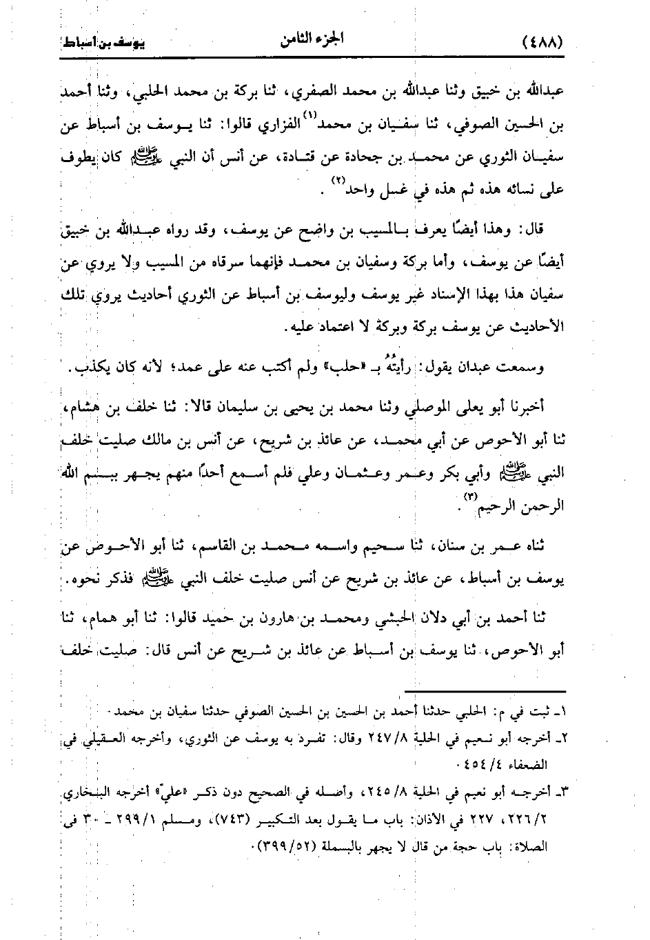 عَبد الله بن خبيق وَحَدَّثنا عَبد اللَّهِ بْنُ مُحَمد الصفري، حَدَّثَنا بركة بن مُحَمد الحلبي وَحَدَّثنا أَحْمَدُ بْنُ الْحُسَيْنِ الصُّوفيّ، حَدَّثَنا سُفْيَانُ بْنُ مُحَمد الْفَزَارِيُّ قالوا، حَدَّثَنا يُوسُفُ بْنُ أَسْبَاطٍ عَنْ سُفْيَانَ الثَّوْريّ عَنْ مُحَمد بْنِ جُحَادَةَ، عَن قَتادَة، عَن أَنَس، أَن النَّبيّ صَلَّى اللَّهُ عَلَيهِ وَسلَّمَ كَانَ يَطُوفُ عَلَى نِسَائِهِ هَذِهِ ثُمَّ هَذِهِ فِي غُسْلٍ وَاحِدٍ.