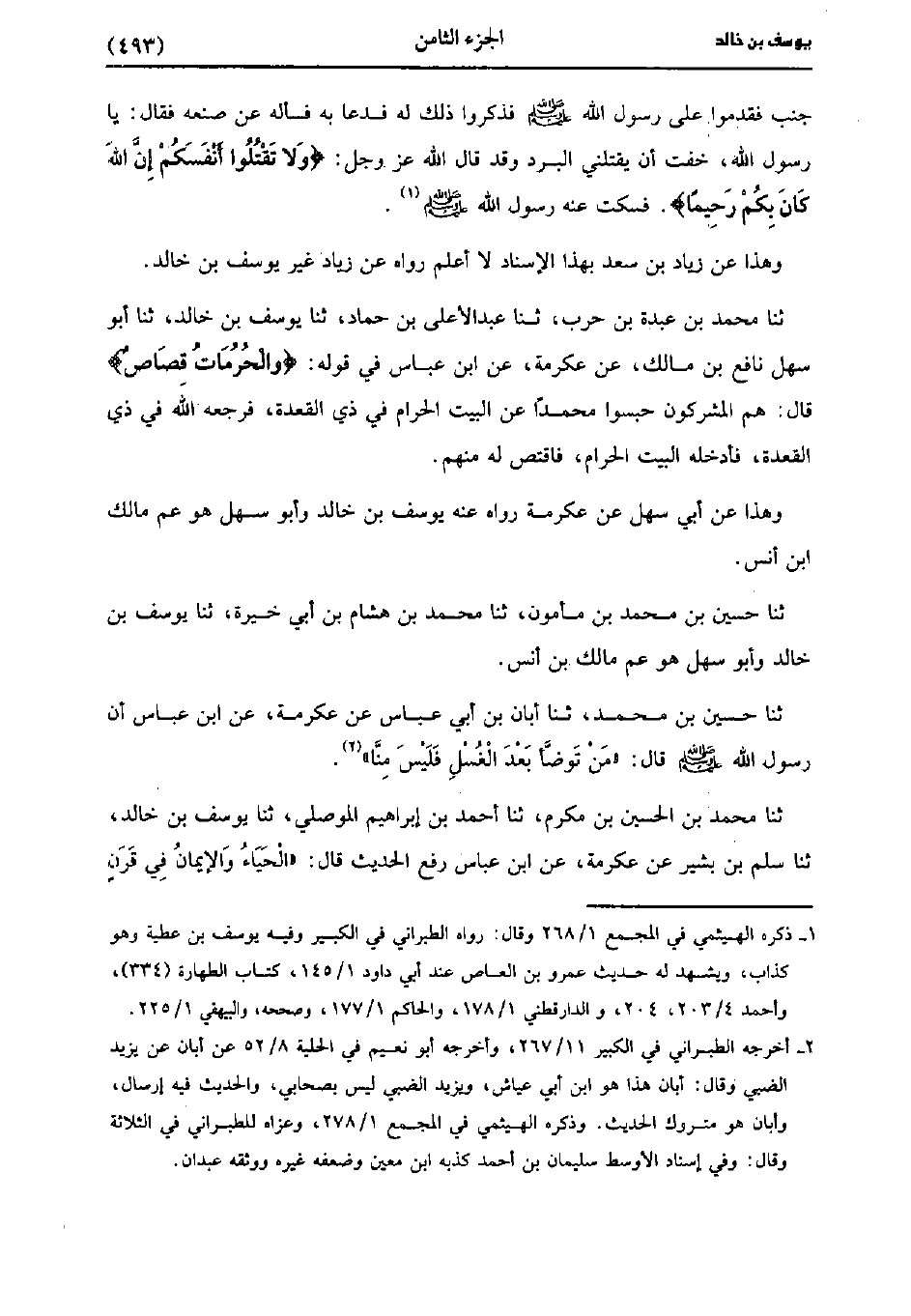 حَدَّثَنَا مُحَمد بْنُ عبدة بن حرب، حَدَّثَنا عَبد الأَعْلَى بْنُ حَمَّادٍ، حَدَّثَنا يوسف بن خالد، حَدَّثَنا أَبُو سَهْلٍ نَافِعُ بْنُ مَالِكٍ، عَنْ عِكرمَة، عنِ ابْنِ عَبَّاسٍ في قوله والحرمات قصاص قَالَ هُمُ الْمُشْرِكُونَ حَبَسُوا مُحَمَّدًا عَنِ الْبَيْتِ الْحَرَامِ فِي ذِي الْقِعْدَةِ فَرَجَّعَهُ اللَّهُ فِي ذِي الْقِعْدَةِ فَأَدْخَلَهُ الْبَيْتَ الْحَرَامَ فَاقْتَصَّ لَهُ مِنْهُمْ.