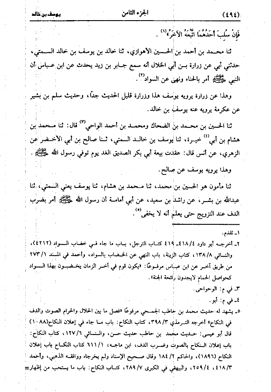 حَدَّثَنَا مُحَمد بْنُ أَحْمَدَ بْنِ الحسين الأهوازي، حَدَّثَنا خالد بن يوسف بن خالد السَّمْتِيُّ، حَدَّثني أَبِي عَنْ زُرَارَةَ بن أبى الحلال أَنَّهُ سَمِعَ جَابِرَ بْنَ زَيْدٍ يُحَدِّثُ، عنِ ابْنِ عَبَّاسٍ، أَن النَّبيّ صَلَّى اللَّهُ عَلَيهِ وَسلَّمَ أَمَرَ بِالْحِنَّاءِ وَنَهَى عَنِ السَّوَادِ.
