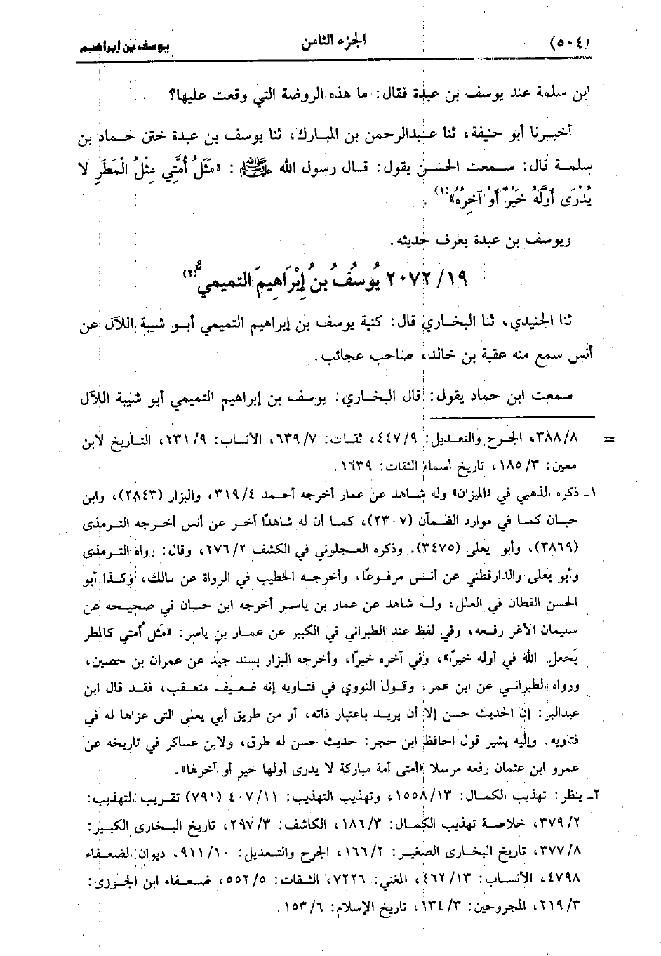 حَدَّثَنَا أبو حنيفة، حَدَّثَنا عَبد الرحمن ابن المُبَارك، حَدَّثَنا يُوسُفُ بْنُ عَبْدَةَ خَتْنُ حَمَّادِ بْنِ سَلَمَةَ، قَالَ: سَمِعْتُ الْحَسَنَ يَقُولُ: قَال رَسُول اللهِ صَلَّى اللَّهُ عَلَيهِ وَسلَّمَ مِثْلُ أُمَّتِي مِثْلُ الْمَطَرِ لا يُدْرَى أَوَّلُهُ خَيْرًا أَوْ آخِرُهُ.