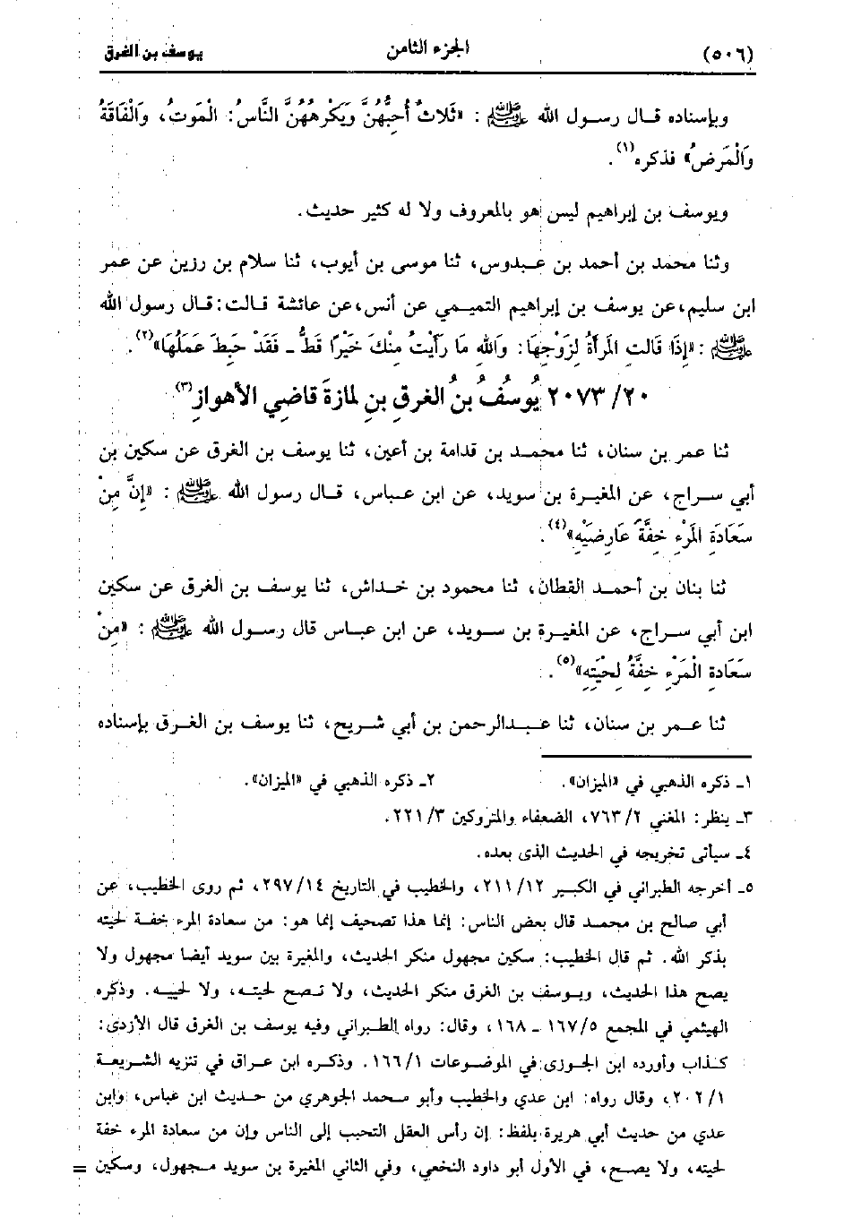 حَدَّثَنَا عُمَر بْنُ سِنَانٍ، حَدَّثَنا مُحَمد بْنُ قُدَامَةَ بْنِ أَعْيَنٍ، حَدَّثَنا يُوسُفُ بْنُ الْغَرِقِ عَنْ سُكَيْنِ بْنِ أَبِي سِرَاجٍ عَنِ الْمُغِيرَةِ بْنِ سُوَيْدٍ، عنِ ابْنِ عَبَّاسٍ قَال رَسُول اللهِ صَلَّى اللَّهُ عَلَيهِ وَسلَّمَ: إِنَّ مِنْ سَعَادَةِ المرء خفة عارضيه.