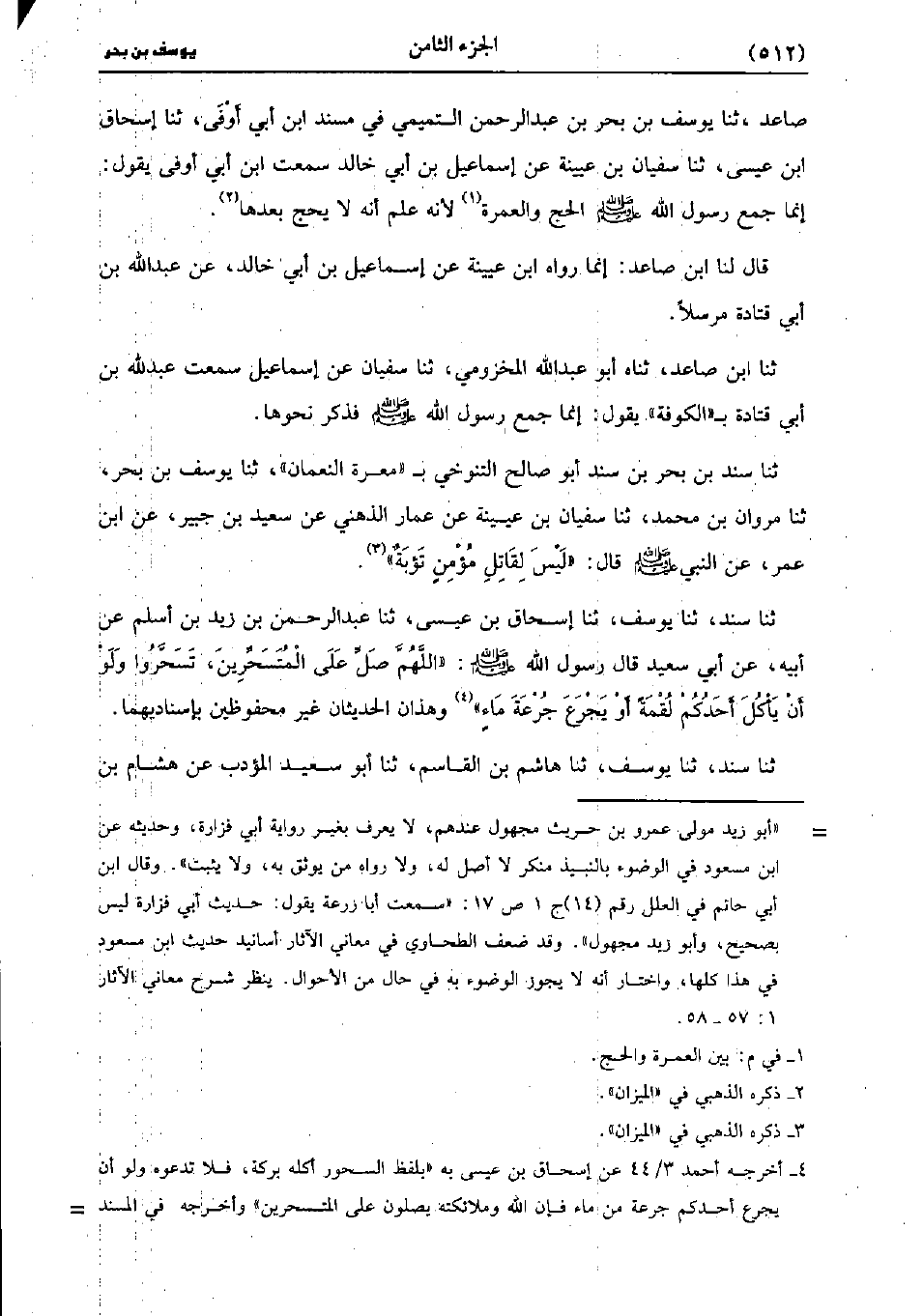 حَدَّثَنَا سند، حَدَّثَنا يوسف، حَدَّثَنا إسحاق بن عيسى، حَدَّثَنا عَبد الرَّحْمَنِ بْنِ زَيْدِ بْنِ أَسْلَمَ، عَنْ أَبِيهِ، عَن أَبِي سَعِيد قَال رَسُول اللهِ صَلَّى اللَّهُ عَلَيهِ وَسلَّمَ اللَّهُمَّ صَلِّ عَلَى الْمُتْسَحِرِينَ تَسَحَّرُوا وَلَوْ أَنْ يَأْكُلَ أَحَدُكُمْ لُقْمَةً أَوْ يَجْرَعَ جُرْعَةَ مَاءٍ وهذان الحديثان غير محفوظين بإسناديهما.
