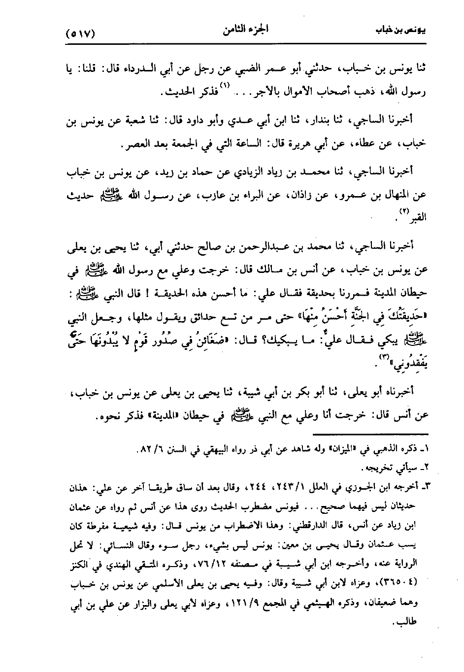 حَدَّثَنَا الساجي، حَدَّثَنا مُحَمد بْنُ عَبد الرَّحْمَنِ بن صالح، حَدَّثني أبى، حَدَّثَنا يَحْيى بْن يَعْلَى عَنْ يُونُس بْنِ خَبَّابٍ، عَن أَنَس بْنِ مَالِكٍ قَالَ خَرَجْتُ، وَعلي مَعَ رَسُولِ اللَّهِ صَلَّى اللَّهُ عَلَيْهِ وَسَلَّمَ فِي حِيطَانِ الْمَدِينَةِ فَمَرَرْنَا بِحَدِيقَةٍ فَقَالَ عَلِيٌّ مَا أَحْسَنَ هَذِهِ الْحَدِيقَةُ قَالَ النَّبِيُّ صَلَّى اللَّهُ عَلَيهِ وَسلَّمَ حَدِيقَتُكَ فِي الْجَنَّةِ أَحْسَنُ مِنْهَا حَتَّى مَرَّ مِنْ تِسْعِ حَدَائِقَ وَيَقُولُ مِثْلُهَا وَجَعَلَ النَّبِيُّ صَلَّى اللَّهُ عَلَيهِ وَسلَّمَ يَبْكِي فَقَالَ عَلِيٌّ مَا يُبْكِيكَ قَالَ ضَغَائِنُ فِي صُدُورِ قَوْمٍ لا يُبْدُونَهَا حَتَّى يَفْقِدُونِي.