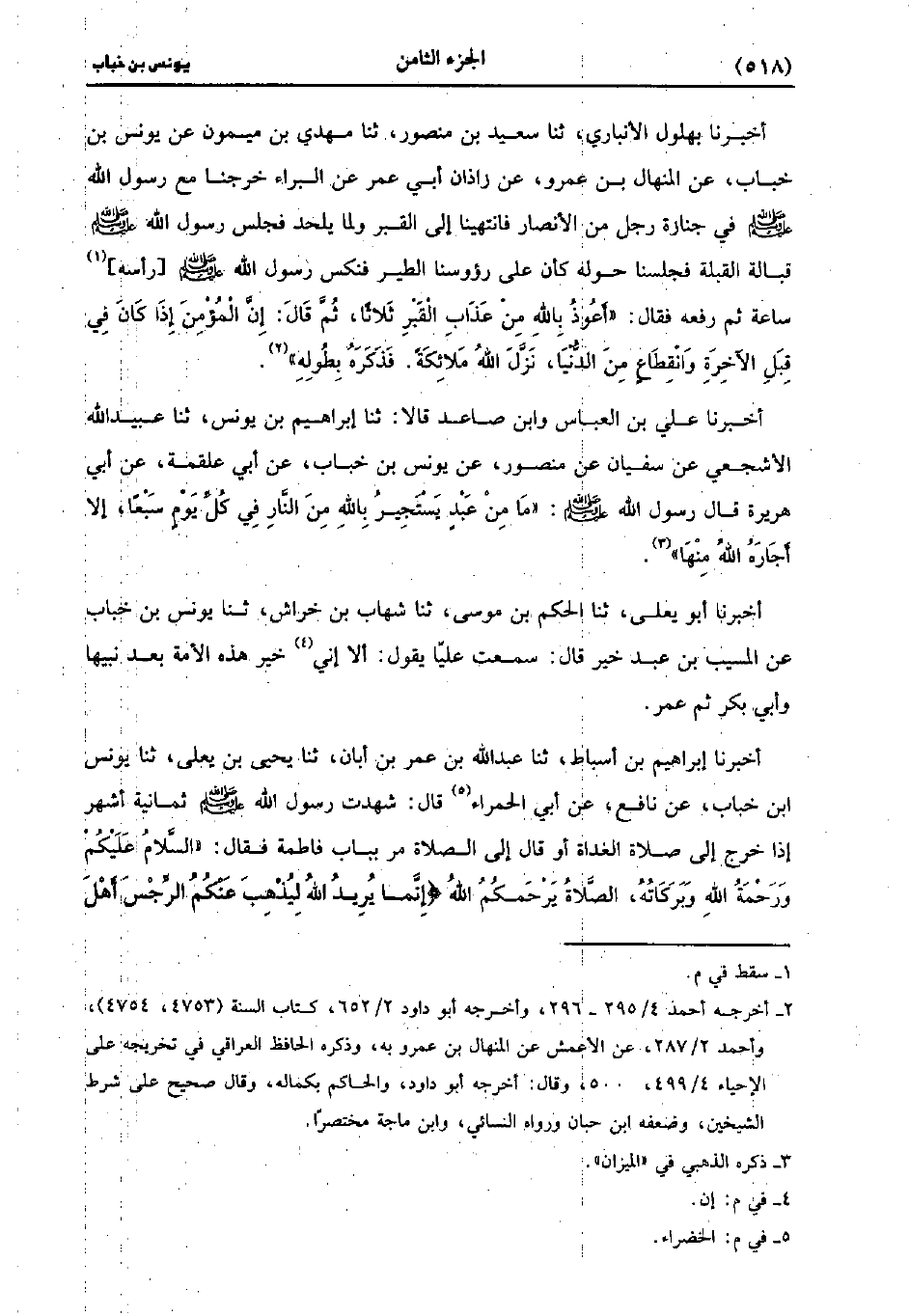 أَخْبَرنا بهلول الأَنْبَارِيُّ، حَدَّثَنا سَعِيد بْنُ مَنْصُورٍ، حَدَّثَنا مهدي بْن ميمون عَن يُونُس بْن خباب عن المنهال بْنِ عَمْرو عَنْ زَاذَانَ أَبِي عُمَر عَنِ الْبَرَّاءِ خَرَجْنَا مَعَ رَسُولِ اللَّهِ صَلَّى اللَّهُ عَلَيْهِ وَسَلَّمَ في جِنازَة رجل من الأَنْصَارِ فَانْتَهَيْنَا إِلَى الْقَبْرِ وَلَمَّا يُلَحَّدُ فَجَلَسَ رَسُولُ اللَّهِ صَلَّى اللَّهُ عَلَيْهِ وَسَلَّمَ قُبَالَةَ الْقِبْلَةِ فجلسنا حوله كان على رؤوسنا الطَّيْرُ فَنَكَّسَ رَسُولُ اللَّهِ صَلَّى اللَّهُ عَلَيْهِ وَسَلَّمَ رَأْسَهُ سَاعَةً ثُمَّ رَفَعَهُ فَقَالَ أَعُوذُ بِاللَّهِ مِنْ عَذَابِ الْقَبْرِ ثَلاثًا ثُمَّ، قَال: إِنَّ الْمُؤْمِنَ إِذَا كَانَ فِي قِبَلِ الآخِرَةِ وَانْقِطَاعٍ مِنَ الدُّنْيَا نَزَّلَ اللَّهُ مَلائِكَةً فَذَكَرَهُ بطوله.
