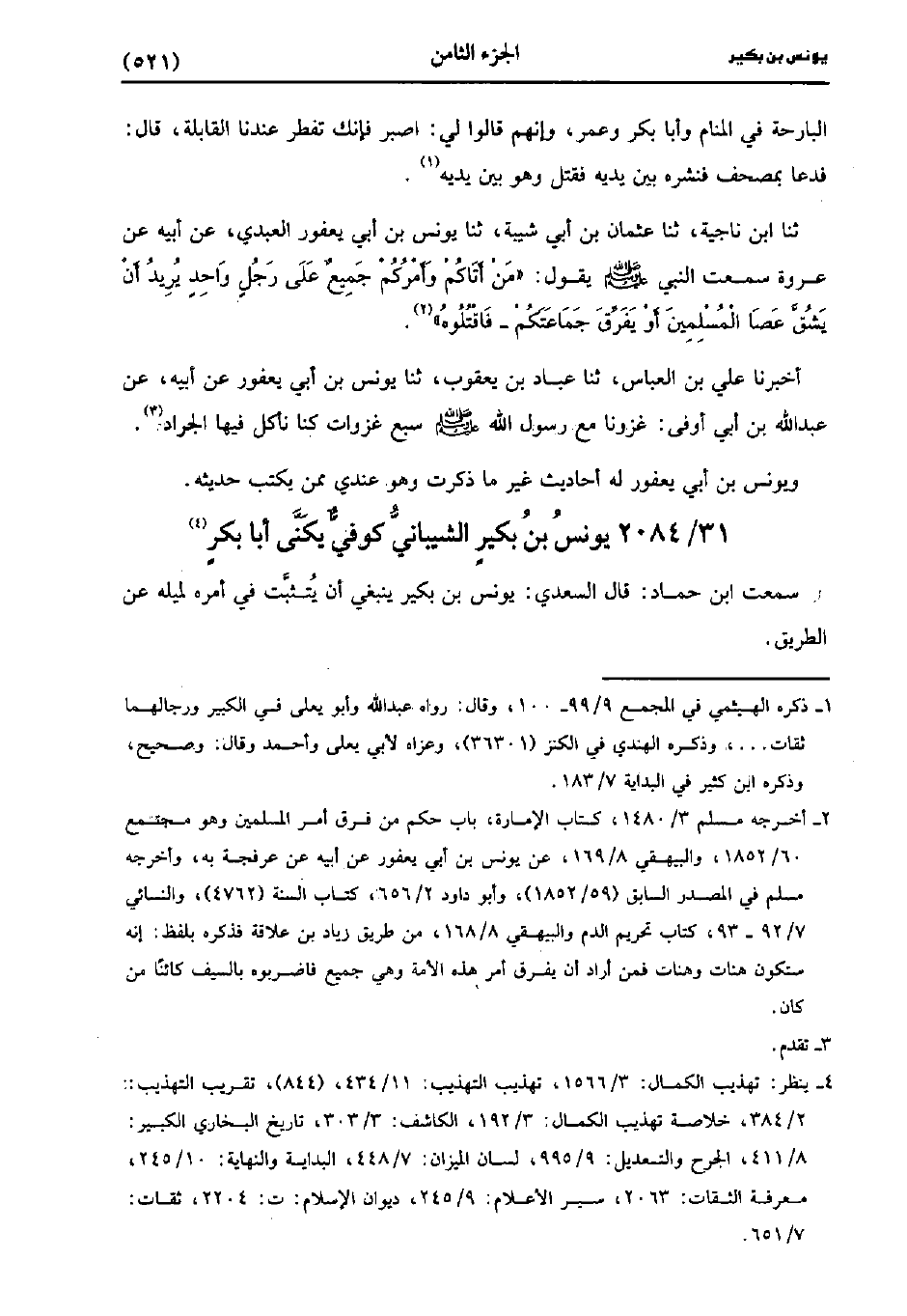 2084- يُونُس بْن بُكَير الشيباني كوفي، يُكَنَّى أَبَا بَكْر.