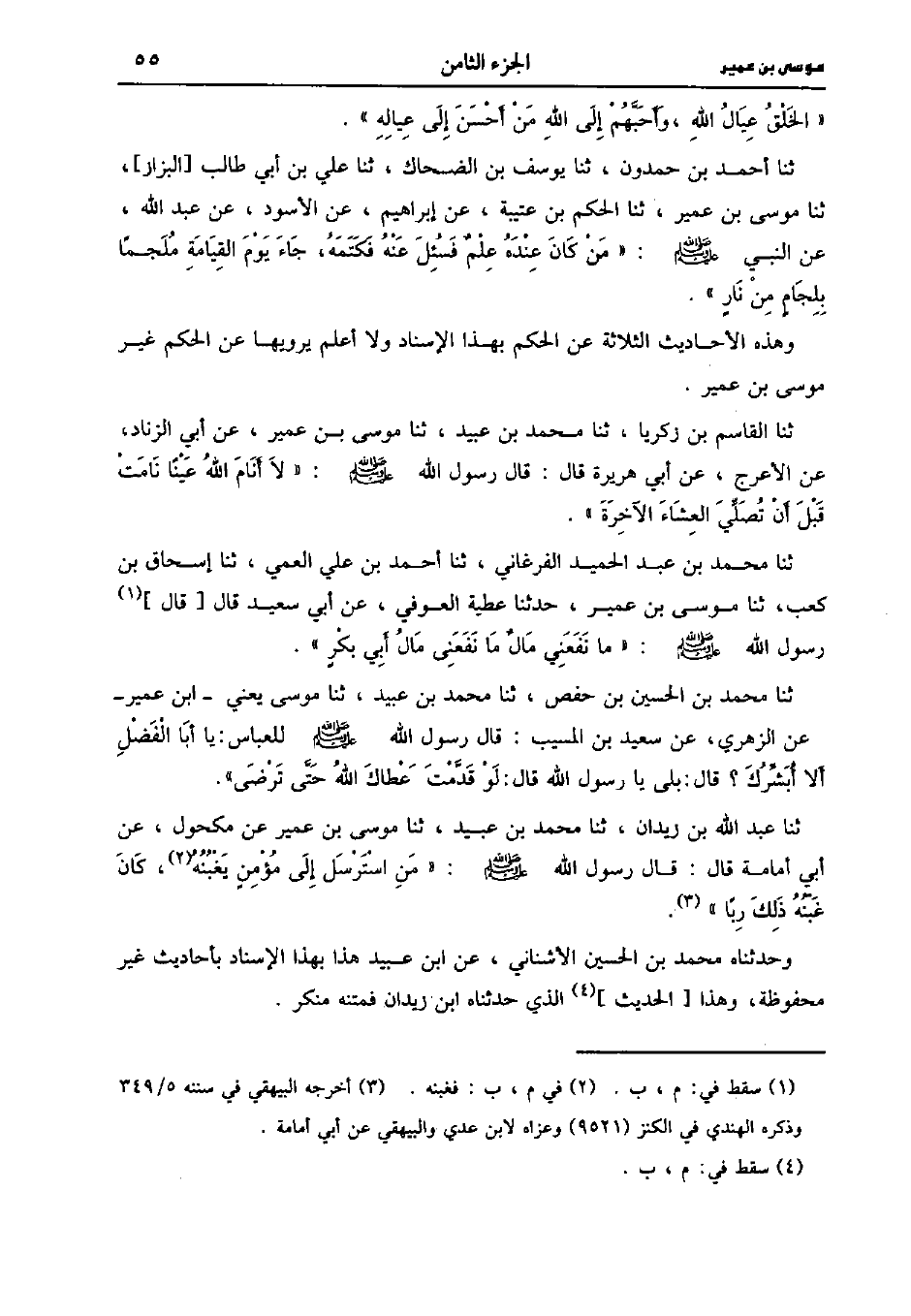 حَدَّثَنَا أَحْمَدُ بْنُ حَمْدُونٍ، حَدَّثَنا يوسف بن الضحاك، حَدَّثَنا عَلِيِّ بْنِ أَبِي طَالِبٍ، حَدَّثَنا موسى بن عُمَير، حَدَّثَنا الْحَكَمِ بْنِ عُتَيْبَةَ عَنْ إِبْرَاهِيمَ عَنِ الأَسْوَدِ عَنْ عَبد اللَّهِ عَنِ النَّبِيِّ صَلَّى اللَّهُ عَلَيهِ وَسلَّمَ مَنْ كَانَ عِنْدَهُ عِلْمٌ فَسُئِلَ عَنْهُ فَكَتَمَهُ جَاءَ يَوْمَ الْقِيَامَةِ مُلَجَّمًا بِلِجَامٍ مِنْ نَارٍ.