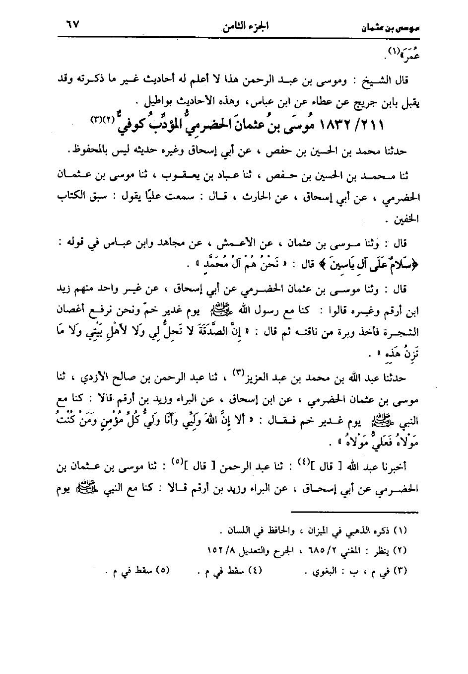 قال وَحَدَّثنا مُوسَى بْنُ عُثْمَانَ الْحَضْرَمِيُّ، عَن أَبِي إِسْحَاقَ عَنْ غَيْرِ وَاحِدٍ مِنْهُمْ زَيْدِ بْنِ أَرْقَمَ وَغَيْرِهِ قَالُوا كُنَّا مَعَ رَسُولِ اللَّهِ صَلَّى اللَّهُ عَلَيْهِ وَسَلَّمَ يَوْمَ غَدِيرِ خُمٍّ وَنَحْنُ نَرْفَعُ أَغْصَانَ الشَّجَرَةِ فَأَخَذَ وَبْرَةً مِنْ نَاقَتِهِ ثُمَّ قَال: إِن الصَّدَقَةَ لا تَحِلُّ لِي، ولاَ لأَهْلِ بَيْتِي، ولاَ مَا تَزِنُ هَذِهِ.