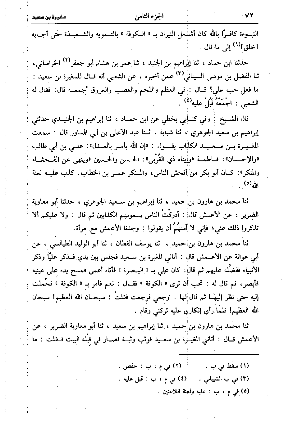 قال الشَّيْخ: وفي كتابي بخطي، عنِ ابْن حَمَّاد، حَدَّثَنا إِبْرَاهِيم بْن الجنيدي، حَدَّثني إِبْرَاهِيم بن سَعِيد الجوهري، حَدَّثَنا شبابة، حَدَّثَنا عَبد الأَعْلَى بْنُ أَبِي الْمُسَاوِرِ، قَالَ: سَمِعْتُ المغيرة بْن سَعِيد الكذاب يَقُول إن اللَّه يأمر بالعدل علي بْن أَبِي طالب والإحسان فاطمة وإيتاء ذي القربي الحسن، وَالحُسَين وينهى عن الفحشاء كَانَ أَبُو بَكْر من أفحش الناس والمنكر عُمَر بْن الخطاب كذب عليه لعنه الله.