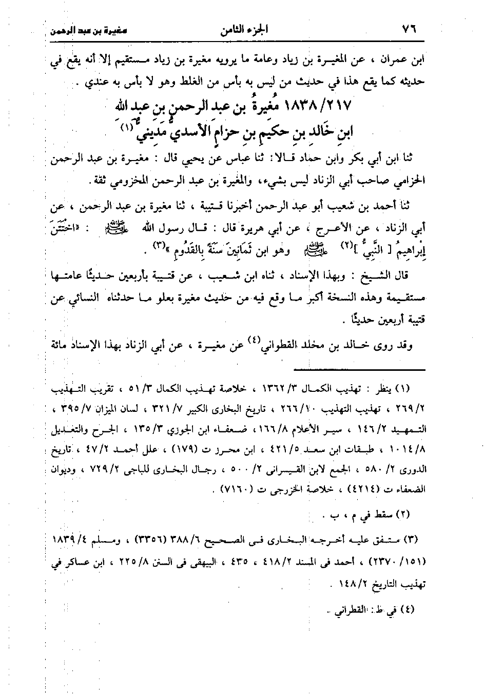 1838- مغيرة بْنِ عَبد الرَّحْمَنِ بْنِ عَبد اللَّه بْن خَالِد بْن حكيم بن حزام الأسدي مديني.
