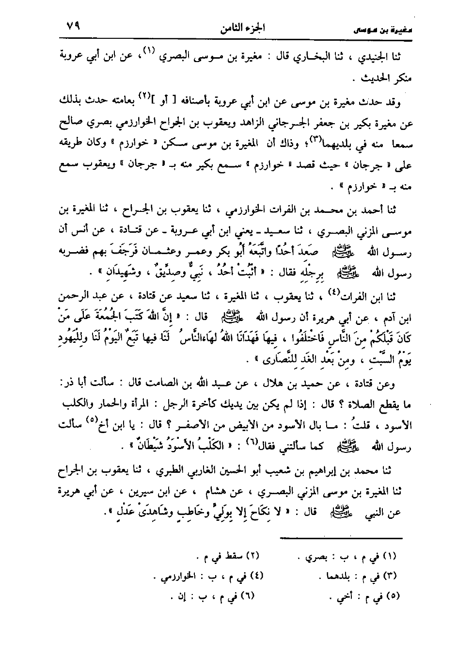 وقد حدث مغيرة بْن مُوسَى، عَن أَبِي عَرُوبة بأصنافه أو بعامته حدث بذلك عن مغيرة بُكَير بْن جَعْفَر الجرجاني الزاهد ويعقوب بْن الجراح الخوارزمي بصري صَالِح سمعا منه فِي بلديهما وذاك أن المغيرة بْن مُوسَى سكن خوارزم وكان طريقه على جرجان حيث قصد خوارزم سمع بُكَير منه بجرجان ويعقوب سمع منه بخوارزم.