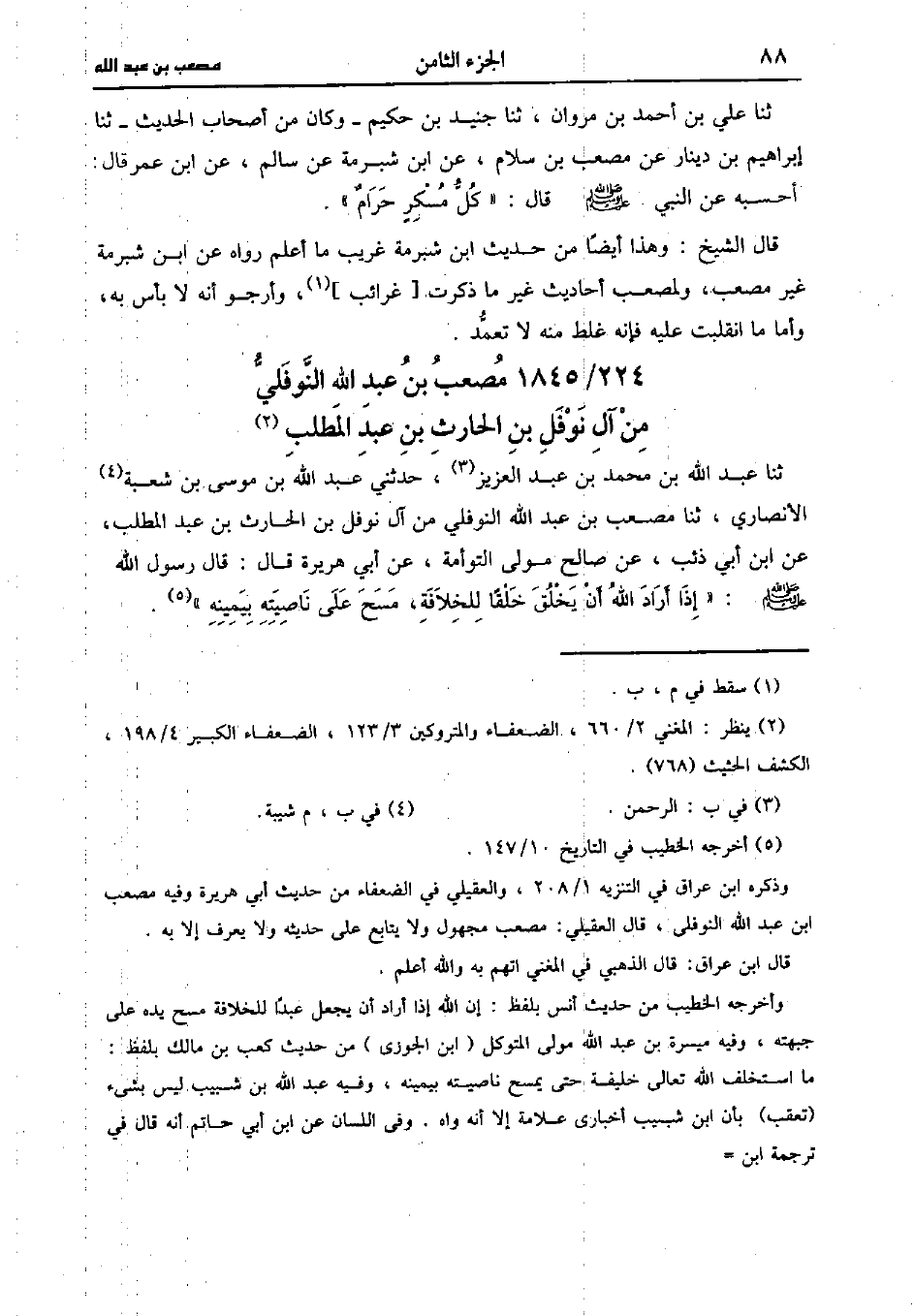 حَدَّثَنَا عَبد اللَّه بْنُ مُحَمد بْنِ عَبد الْعَزِيزِ، حَدَّثني عَبد اللَّهِ بْنُ مُوسَى بْنِ شُعْبَة الأنصاري، حَدَّثَنا مصعب بْن عَبد اللَّه النوفلي من آل نوفل بْن الحارث بْنِ عَبد الْمُطَّلِبِ، عنِ ابْنِ أَبِي ذِئْبٍ عَنْ صَالِحٍ مَوْلَى التَّوْأَمَةِ، عَن أَبِي هُرَيْرَةَ، قَال: قَال رَسُولُ اللَّهِ صَلَّى اللَّهُ عَلَيْهِ وَسَلَّمَ إِذَا أَرَادَ اللَّهُ أَنْ يَخْلُقَ خَلْقًا لِلْخِلافَةِ مَسَحَ على ناصيته بيمينه