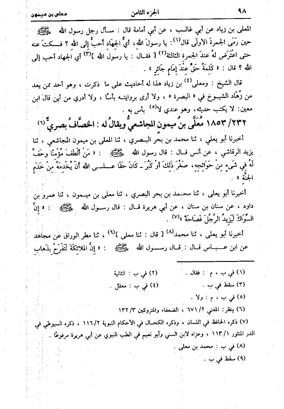 الْمُعَلَّى بْنِ زِيَادِ بْنِ أَبِي غَالِبٍ، عَن أَبِي أُمَامَةَ قَالَ سَأَلَ رَجُلٌ رَسُولُ اللَّهِ صَلَّى اللَّهُ عَلَيْهِ وَسَلَّمَ حِينَ رَمَى الْجَمْرَةَ الأُولَى قَالَ يَا رَسُولَ اللهِ أَيُّ الْجِهَادِ أَحَبُّ إِلَى اللَّهِ فَسَكَتَ عَنْهُ حَتَّى اعْتَرَضَ لَهُ عِنْدَ الْجَمْرَةِ الثَّالِثَةِ، فَقَالَ، يَا رَسُولَ اللهِ أَيُّ الْجِهَادِ أَحَبُّ إِلَى اللَّهِ قَالَ كَلِمَةُ حَقٍّ عِنْدَ إِمَامٍ جَائِرٍ.