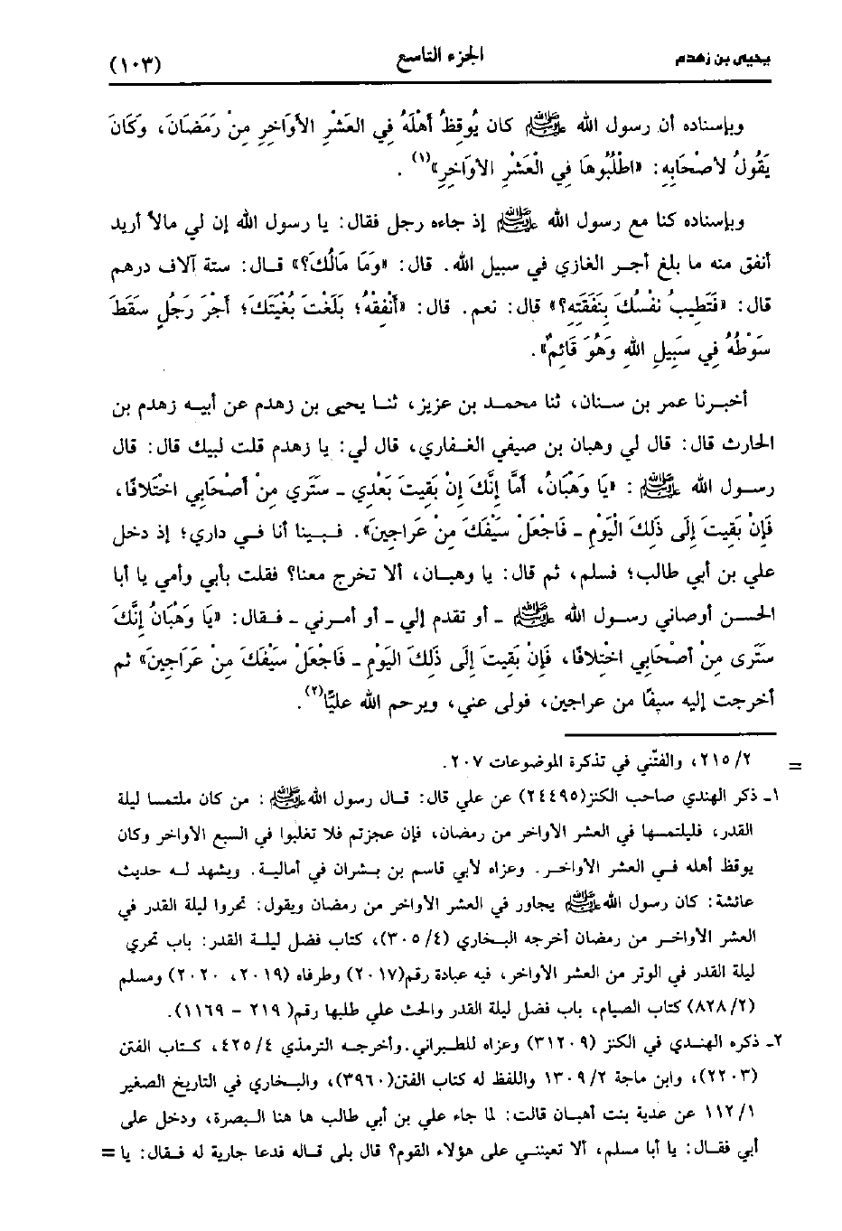 حَدَّثَنَا عُمَر بْنُ سِنَانٍ، حَدَّثَنا مُحَمد بن عزيز، حَدَّثَنا يَحْيى بْنُ زَهْدَمٍ، عَنْ أَبِيهِ زَهْدَمِ بْنِ الْحَارِثِ، قَال: قَال لِي وَهْبَانُ بْنُ صَيْفِيِّ الْغِفَارِيُّ قَال لِي يَا زَهْدَمُ قُلْتُ لَبَّيْكَ، قَال: قَال رَسُولُ اللَّهِ صَلَّى اللَّهُ عَلَيْهِ وَسَلَّمَ يَا وَهْبَانُ أَمَا إِنَّكَ إِنْ بَقِيتَ بَعْدِي سَتَرَى مِنْ أَصْحَابِي اخْتِلافًا فَإِنْ بَقِيتَ إِلَى ذَلِكَ الْيَوْمِ فَاجْعَلْ سَيْفَكَ مِنْ عَرَاجِينَ فَبَيْنَا انا في داري إذ ادخل عَلَيُّ بْنُ أَبِي طَالِبٍ فَسَلَّمَ ثُمَّ قَالَ يَا وَهْبَانُ أَلا تَخْرُجُ مَعَنَا فَقُلْتُ بِأَبِي وَأُمِّي يَا أَبَا الْحَسَنِ أَوْصَانِي رَسُولُ اللَّهِ صَلَّى اللَّهُ عَلَيْهِ وَسَلَّمَ أَوْ تَقَدَّمَ إِلَيَّ أَوْ أَمَرَنِي، فَقَالَ، يَا وَهْبَانُ إِنَّكَ سَتَرَى مِنْ أَصْحَابِي اخْتِلافًا فَإِنْ بَقِيتَ إِلَى ذَلِكَ الْيَوْمِ فَاجْعَلْ سَيْفَكَ مِنْ عَرَاجِينَ ثُمَّ أَخَرَجْتُ إِلَيْهِ سَيْفًا مِنْ عَرَاجِينَ فَوَلَّى عَنِّي ويرحم الله عليا